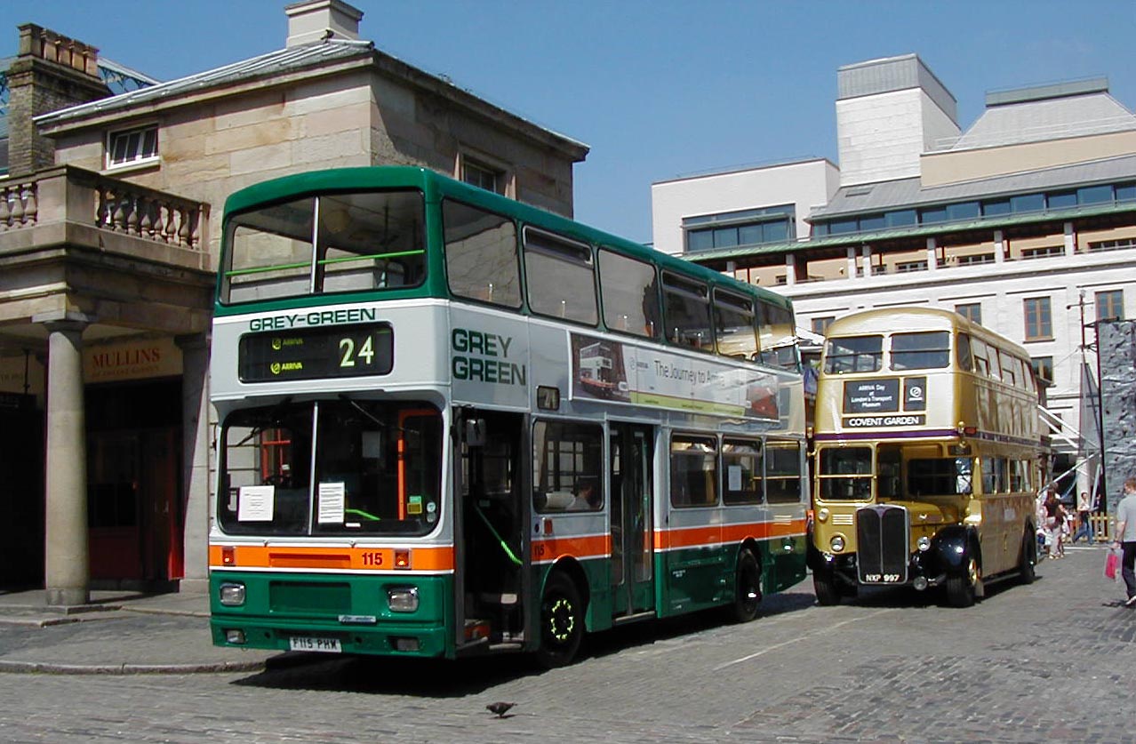 Reflecting the impact that Grey Green had when it took on central London route 24 with a fleet of brand new buses in their striking non-red colours and also acknowledging Grey Green as the seed corn of Arriva, the company chose to present 115 (F115PHM) to the Covent Garden Museum. The occasion on June 14th 2003, was marked by a display in the piaza featuring the Golden Jubilee RT (4712) seen behind 115, the first Wright Gemini bodied DAF DB250LF decker (DW1) and Arriva Midlands North's "Bus of the Future". Volvo 115 had received a full repaint into original Grey Green colours as it finished service with Arriva London.