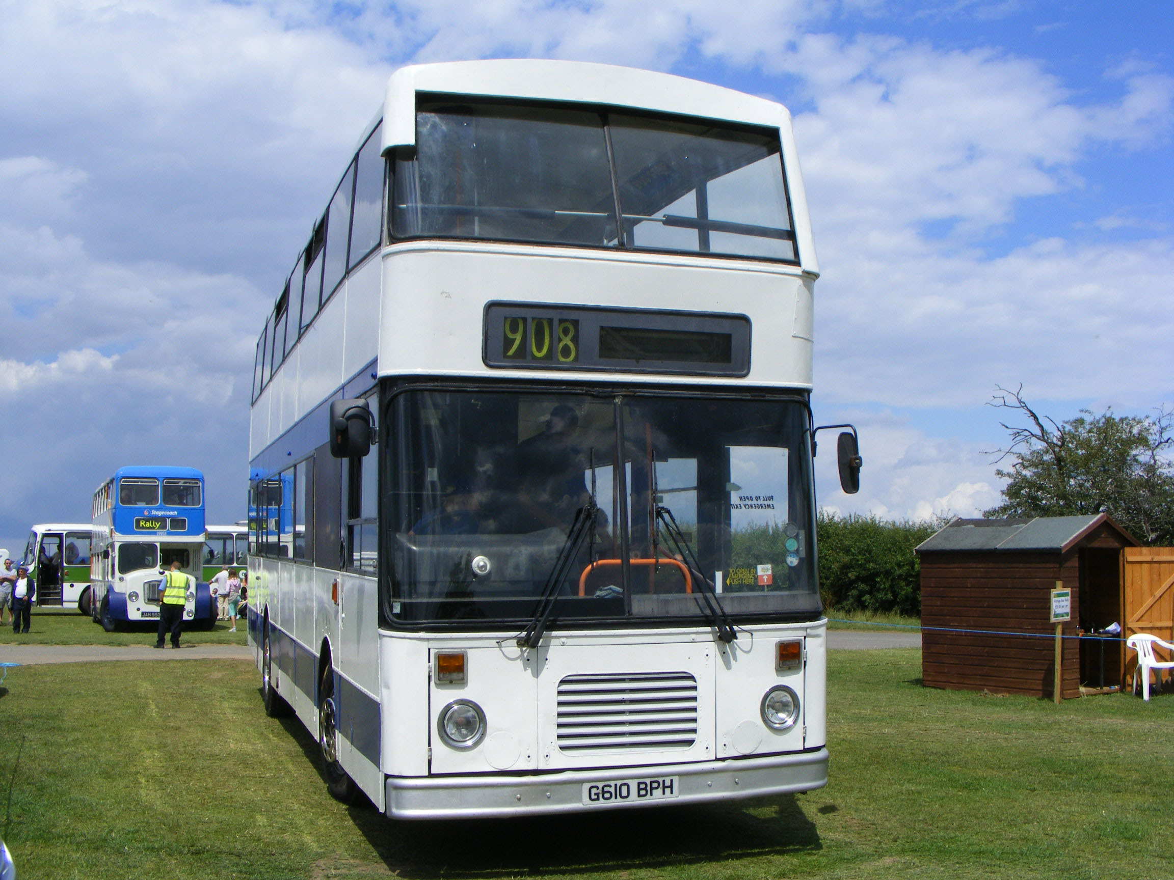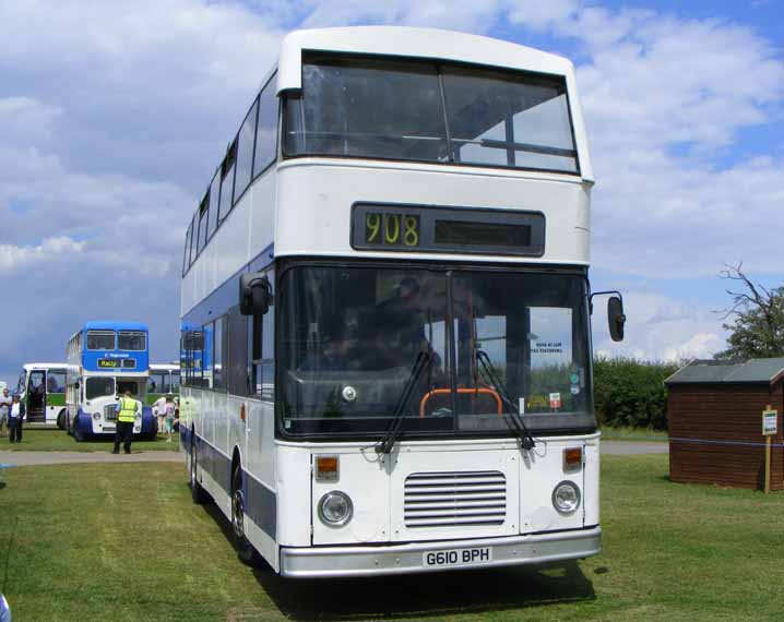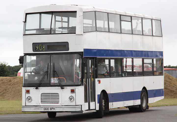 | Former London & Country Citybus 610 (G610BPH) is seen at the Peterborough Bus Rally on a rare dry day in summer 2012. The bus has received formidable front upper deck tree defenders with its new owner, Hereward Coaches. |