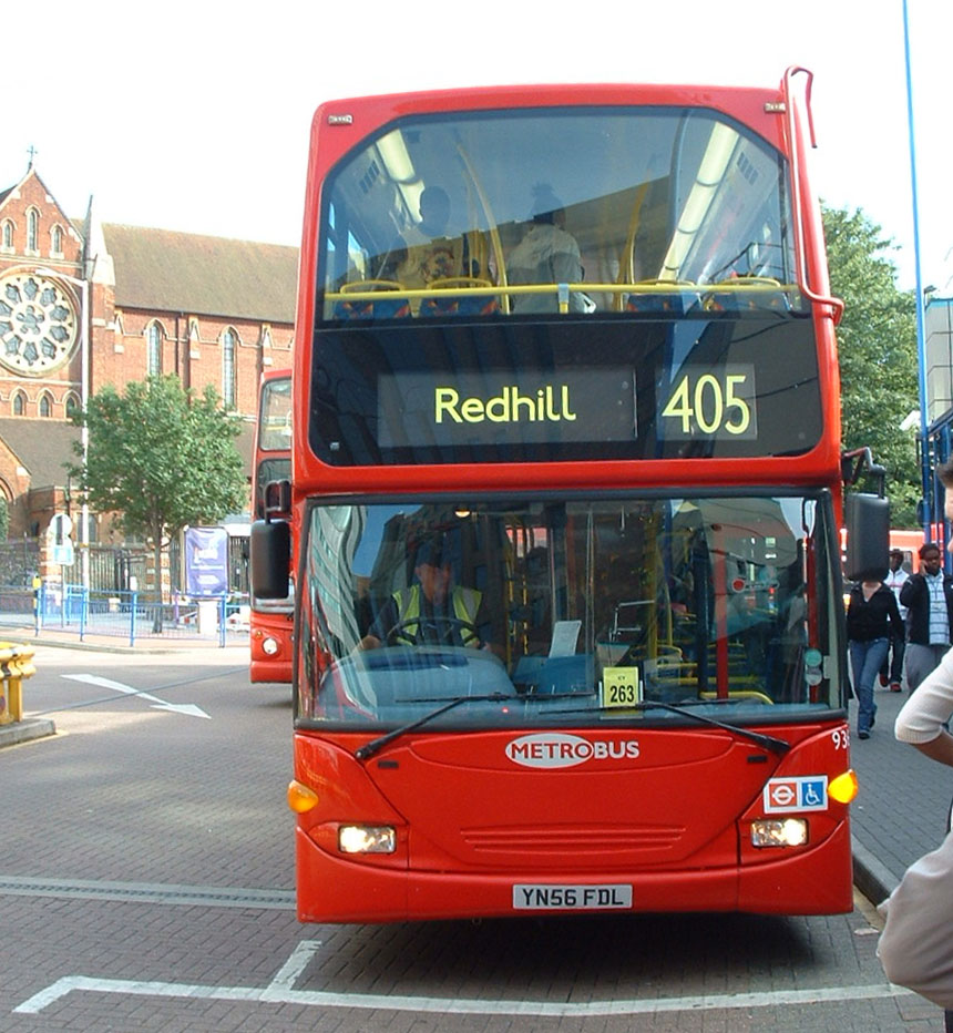 In West Croydon in June 2007 is 936 (YN56FDL). This Scania is on the 405 to Redhill and should surely be green and not red!