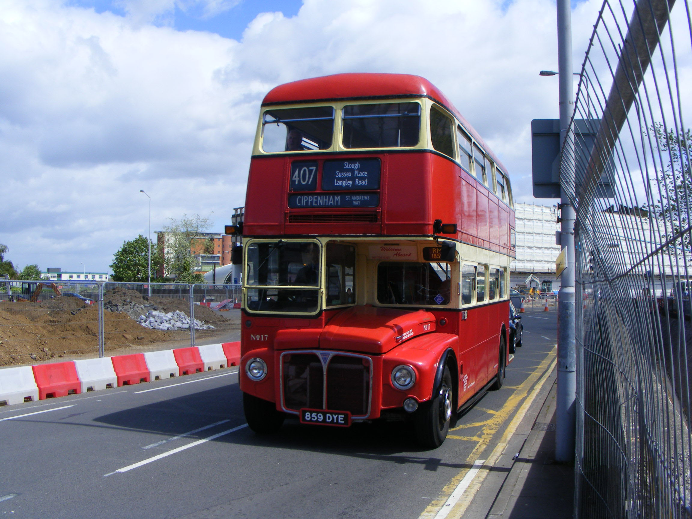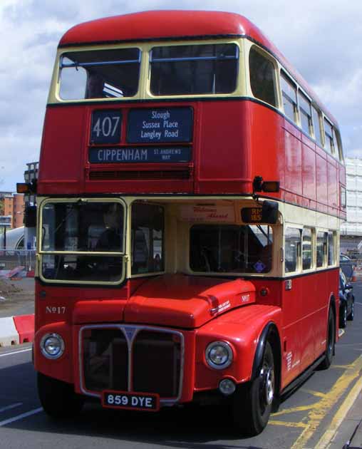 A third Reading Routemaster in preservation is RM1859 (859DYE). Routemasters RM938 and RM1989 were illustrated earlier. Reading Mainline 17, RM1859, is seen on May 22nd 2011 at the annual Slough Running Day. It is on the old 407 route to Cippenham, which used to be operated using green RMLs. The route was one of a pair of cross town services introduced by agreement with Thames Valley and their 69 operated like the 407 from Langley, but further west to Maidenhead.