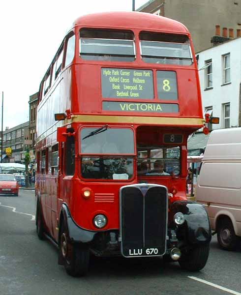 Blue Triangle's RT3871 (LLU670) in Bow Road having just finished a rounder to Victoria on the 8.