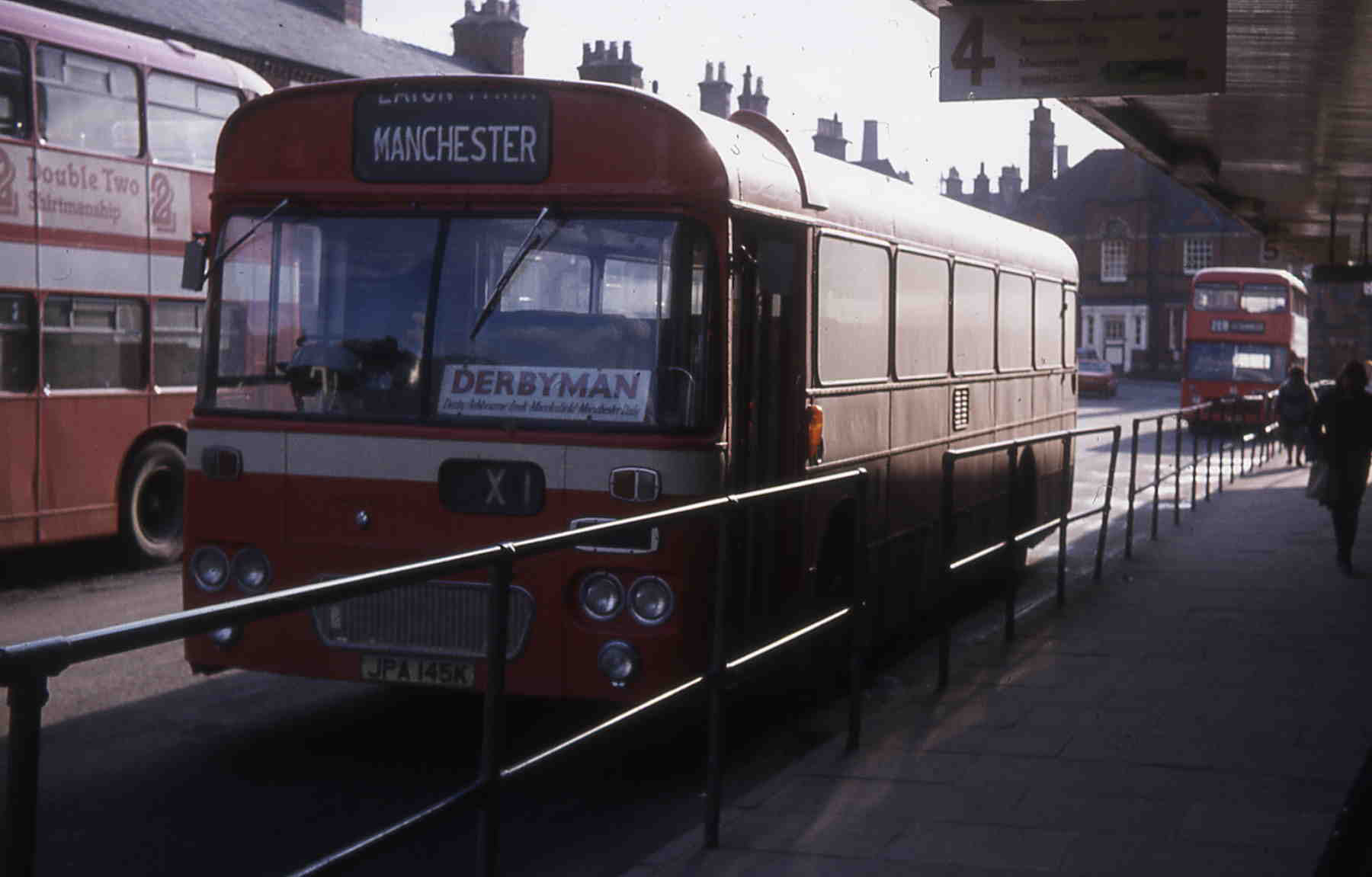 One of Berresford's RP buses got a BET style front end, possibly following accident damage. Former RP45 (JPA145K) is seen in Derby Bus Station ready to cross the Peaks to Manchester, a bus journey no longer possible without changing in Matlock. In 2022 you could take the High Peak's Transpeak TP2 to Matlock and change to Trent's Skyline 199 to Manchester via the Airport. Through tickets were available. A couple of Trent' VR doubedeckers can also be seen in the Bus Station.
