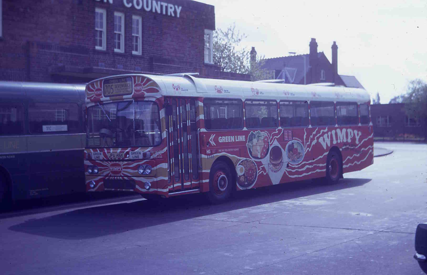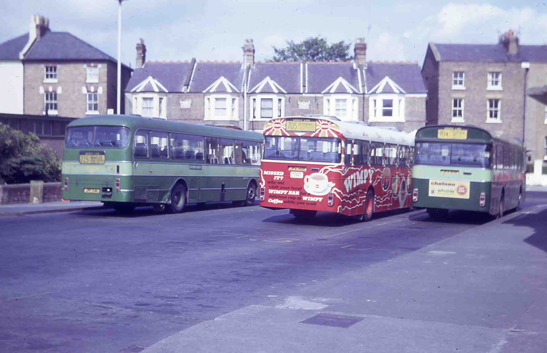 Taken at the same time was this triple Green Line shot. Obviously RP46 is in the centre on the 705 with another RP on the 704 in original livery. On the left is one of the Alexander W bodied AEC Swifts, SMA14 (JPF114K) in the short lived livery before NBC corporate colours arrived. London Country had ditched Lincoln Green in favour of the brighter shade on SMA14, it retained the pale green Green Line waist band as service buses retained the yellow. The Swifts were a strange choice for a Green Line service but were a Hobson's Choice, being foisted on the company - desperate to modernise its inherited fleet - by NBC Head Office, being originally intended for South Wales Transport. The Swift is on the the first London orbital route, the 725 from WIndsor, south of the capital to Gravesend. It was later paralled by the 726 which started at Heathrow rather than Windsor, which ultimately became the X26 and the 725 passed into history.
