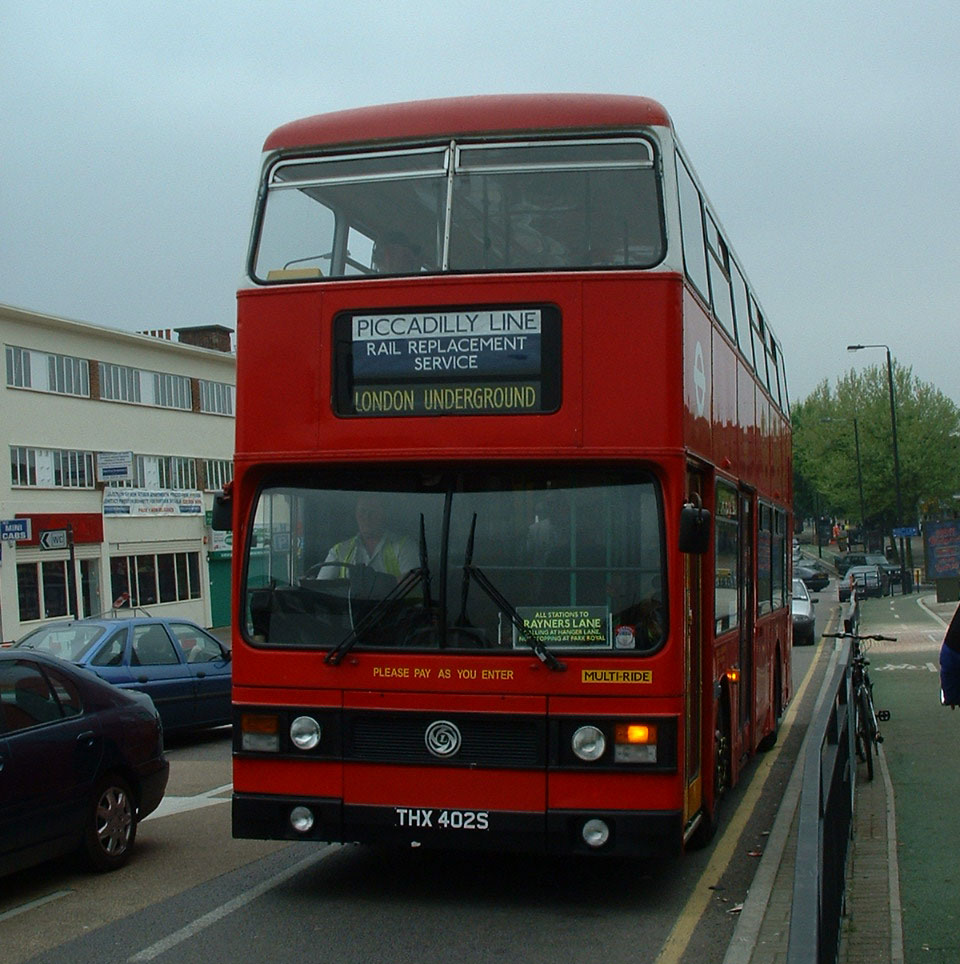 Both London's first Titan TNs, officially retired, T1 and T2 were performing on the 8 on June 4th 2004, the last day of Routemaster operation on the route. Titan T2 (THX402S) is seen in Bethnal Green Road. The Park Royal bodied examples were the only ones with THX-S registrations.