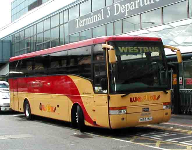 DAF SB3000/Van Hool from 2001 is another Westbus coach outside Heathrow's Terminal 3. It is part of a batch which was shared with National Express' other airport operations.