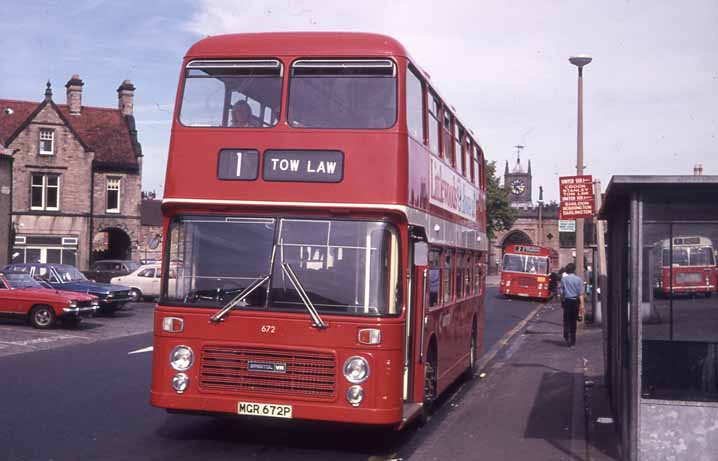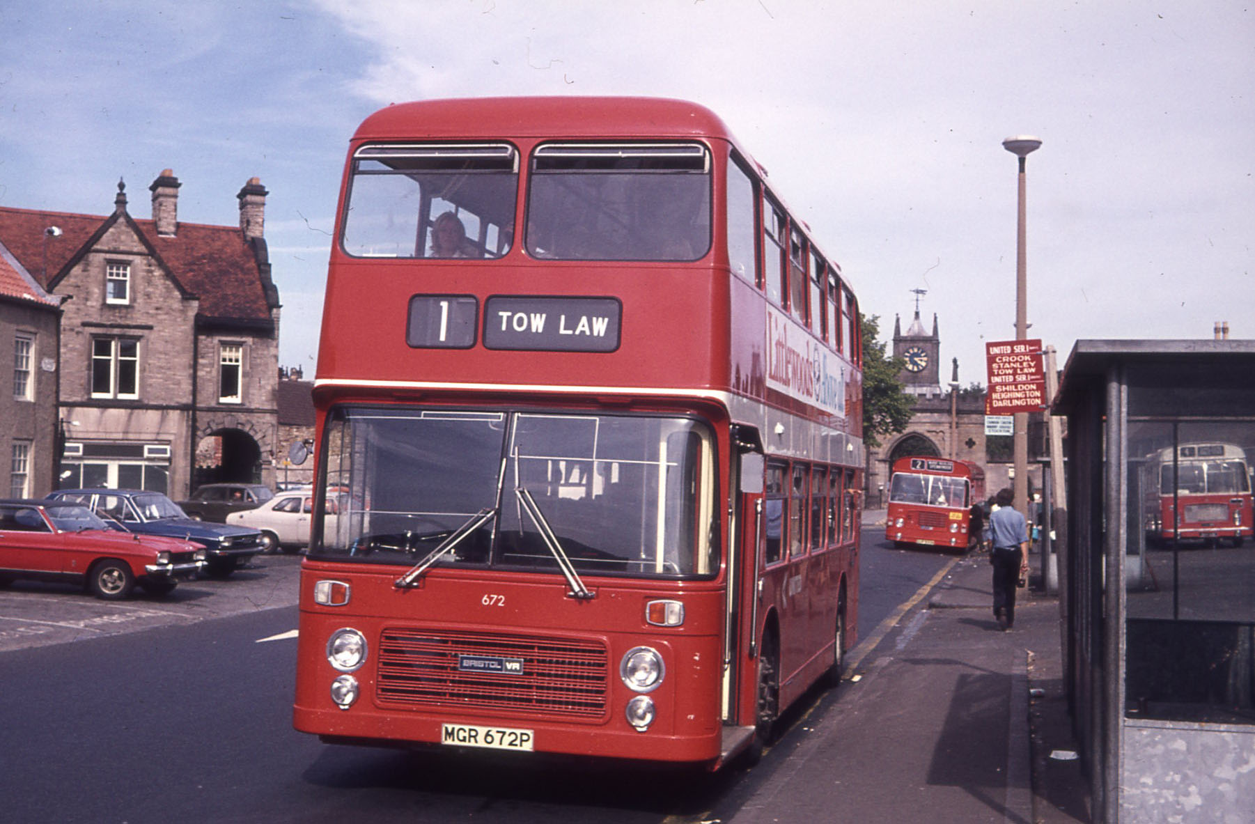 A more conventional Bristol VRTSL3, 672 (MGR672P) is also seen in 1977 in Bishop Auckland Bus Station in full NBC garb on route 1 to Tow Law. Note the Bristol LH on the stand behind.