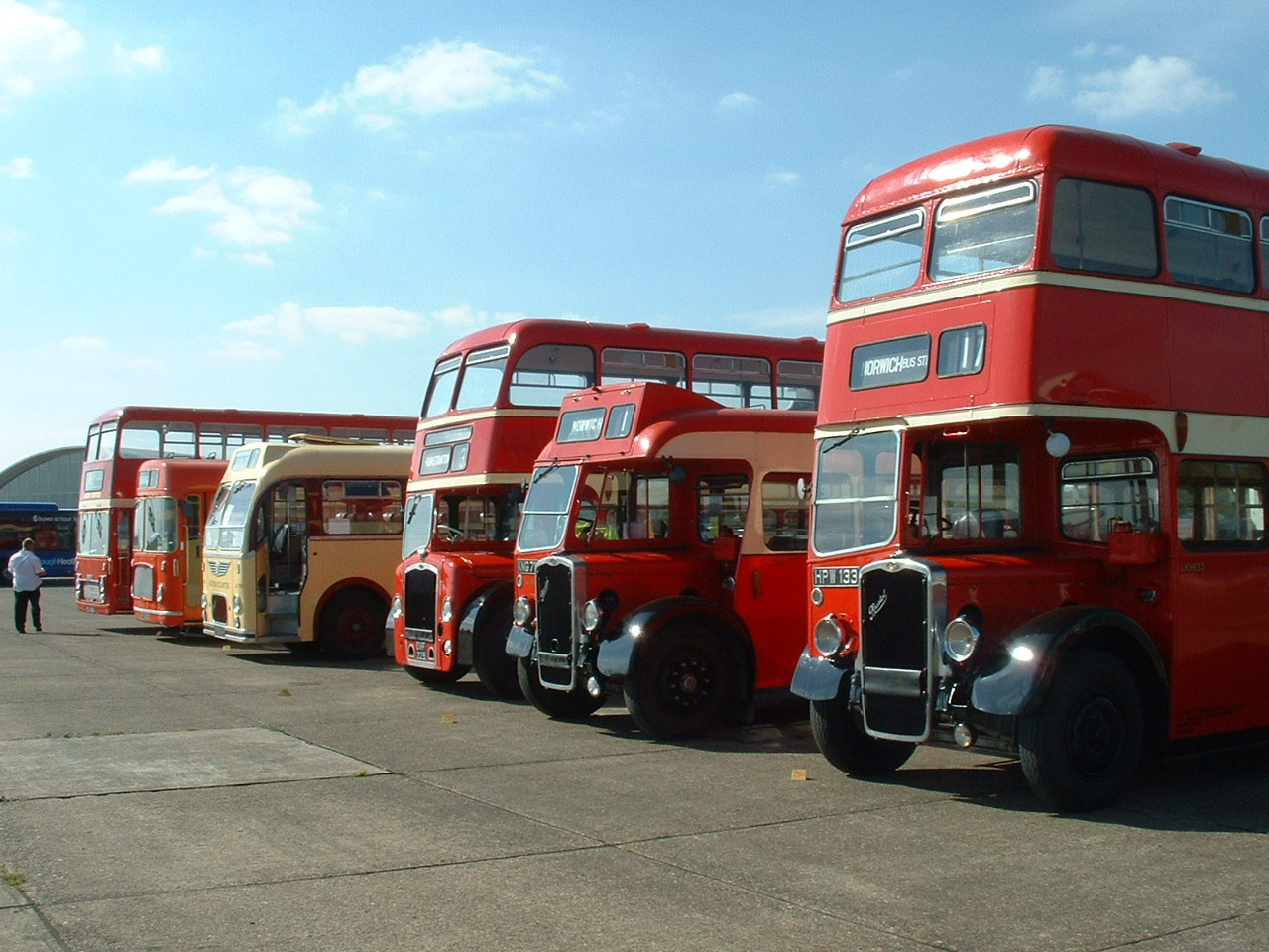 The complete line up with new addition David Gray's 1949 highbridge Bristol K5G, 133 (HPW133) nearest the camera. Next we have Bristol LL5G LL718, Lodekka LKD229, coach LM789 and the RESL and VR, all from the Eastern Transport Collection.