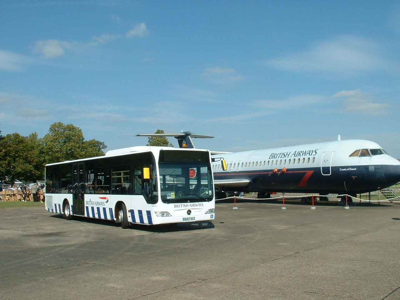 A relatively late entry in the rally was this Mercedes Citaro of British Airways. We thought we would find a spot in the relatively free space around rally control for it. However, as luck would have it, the Museum had moved one of the front line display planes and it could be conveniently located next to form British Airways BAC 1-11, "County of Dorset".