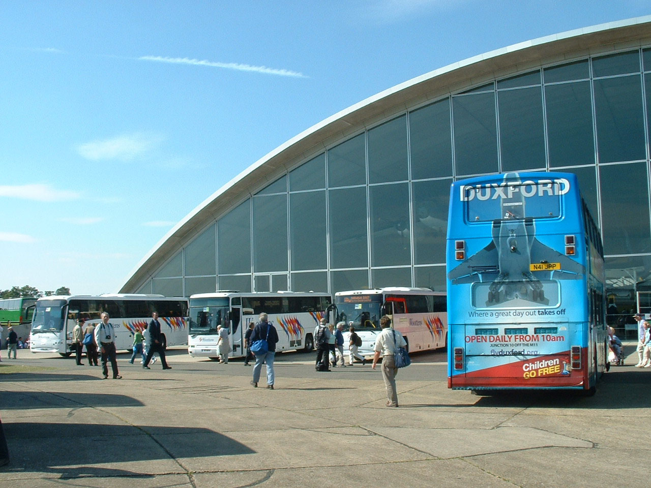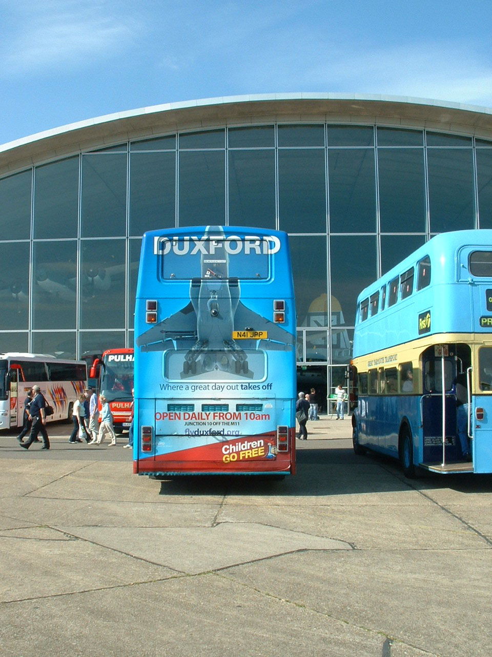 This bus literally turned up on the day and got a "pride of place" positioning for fairly obvious reasons. Supporting the Duxford advertisemnet is Arriva the Shires Northern Counties bodied Olympian 5141 (N41JPP). To the left are the trio of Woottens coaches which took part in the Plaxton Double Gold Run.