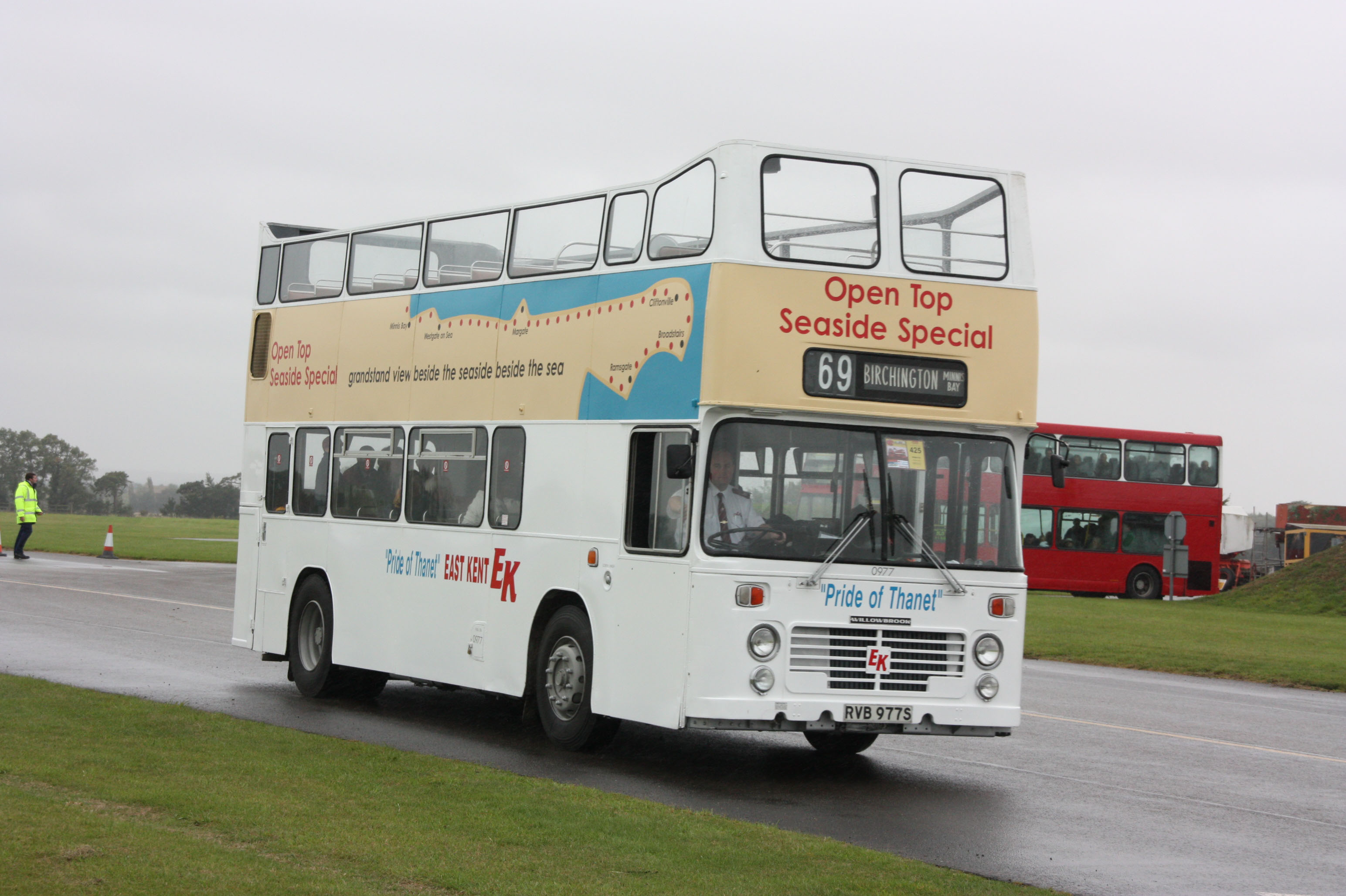 Following roof damage in 1981, Willowbrook Bodied Bristol VRTSL3 7977 (RVB977S) was converted for open top use. It was sold to Walls of Fallowfield in 1992 and on to Chepstow Classic Buses around 2000. Its current group of preservationists acquired it in June 2008 and brought it along to SHOWBUS that year, though this picture is of it arriving at Duxford in 2010.