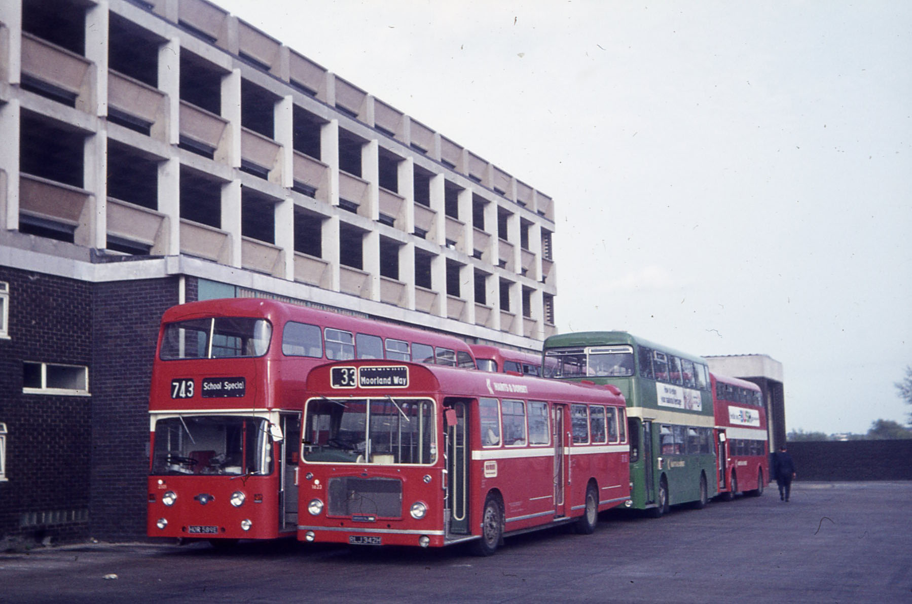 An earlier flat screen dual door RELL6G, 1673 (RLJ342H), is seen surrounded by Roe bodied doubledeckers - not what you would expect in a former Tilling fleet. Immediately behind in green, is one of the former Fleetlines ordered by Provincial but delivered to H&D. The other deckers are three of the four lowheight PDR1/2 Atlanteans delivered to King Alfred. Next to 1673 is the first of the quartet 2302 (HOR589E).