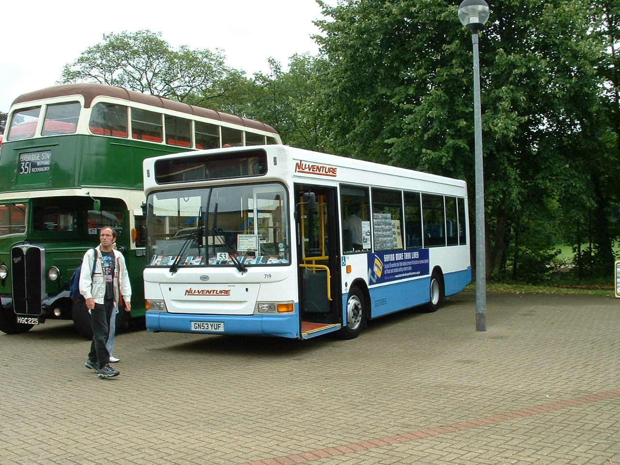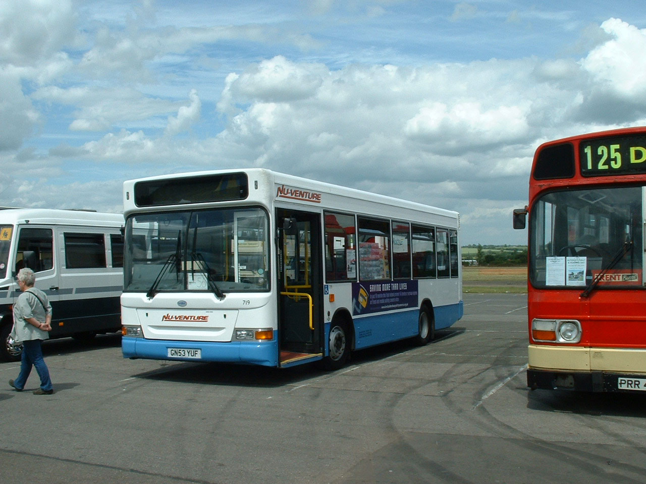 When new this bus was in an impressive white and blue scheme which had something of an American or Australian feel to it with flash MTT branding for Merthyr Tydfil Transport, presenting an image far removed from the staid Corporation maroon and cream half cab buses of recent history in the fleet. Still looking flash, D101NDW is seen with Nu-Venture at the 2003 Cobham Bus Rally. |