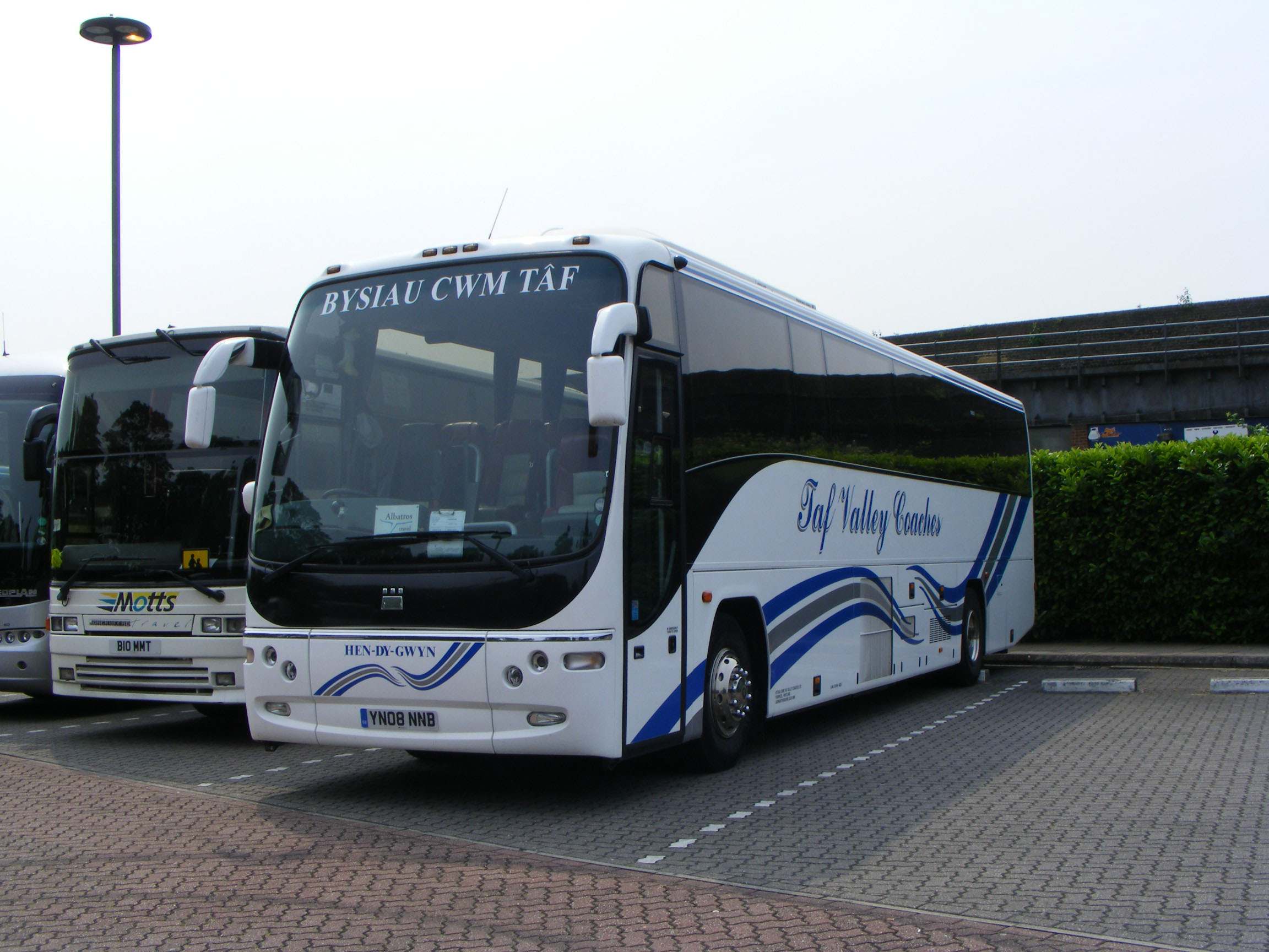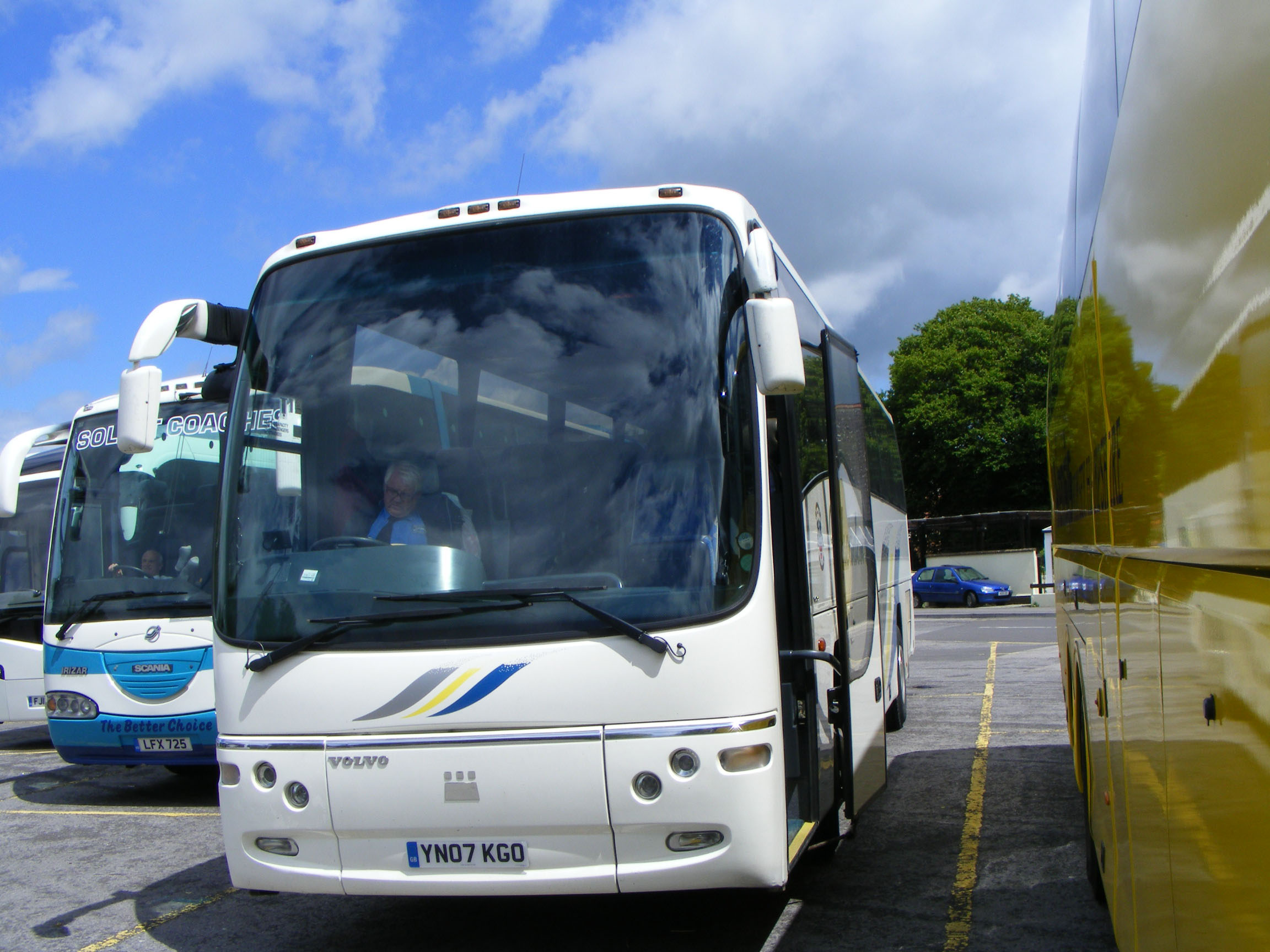 In Exeter Coach Station in August 2013 is FJ56YWH, another Plaxton Panther bodied Volvo B12B new to Dunn Line for National Express work as 5628. It was in the ownership of Llew Jones of Llanrwst, whose royal blue livery it was sorely missing. As can be seen from the paper bills in the window it was operating under contract to David Urquhart Travel. Picture ref A73 |
