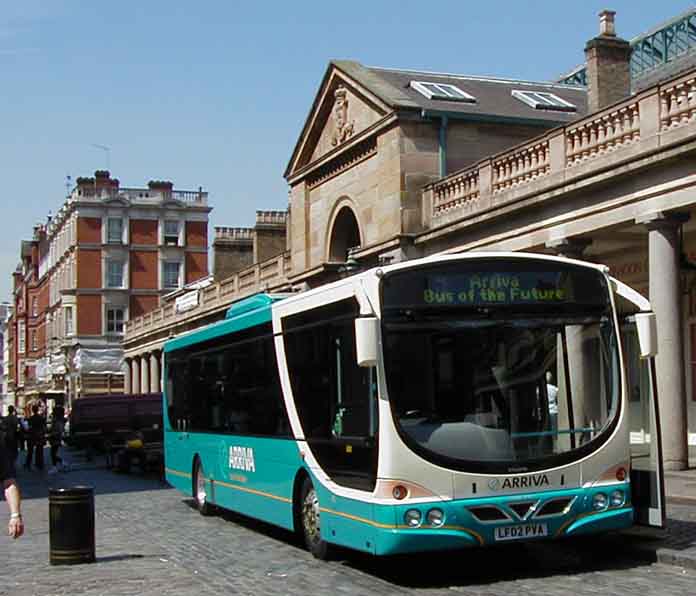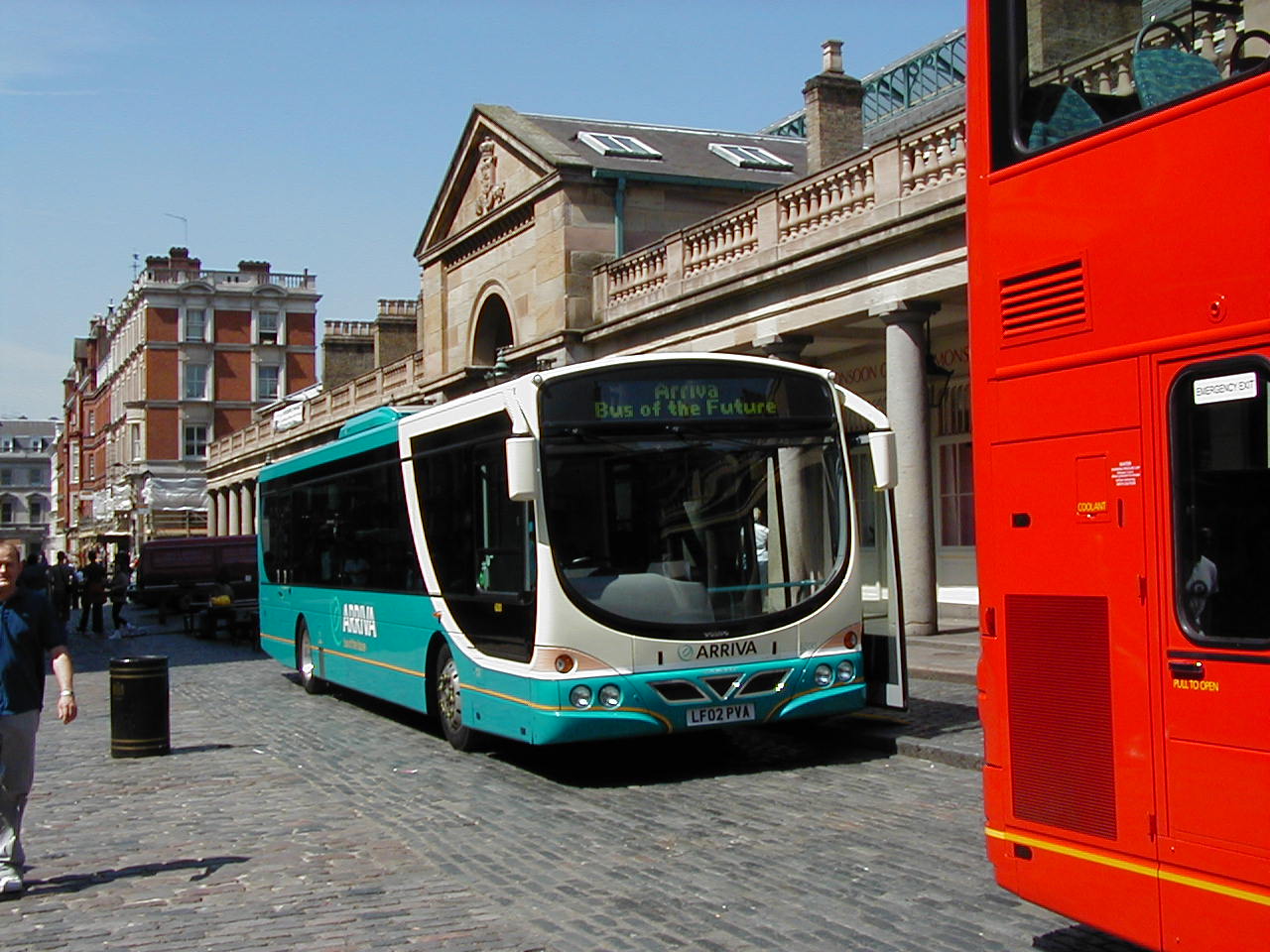 Arriva's supposed 2002 Bus of the Future. It is seen at Covent Garden on the occasion of the donation of an ex Grey Green Volvo Citybus to the Museum to represent the early days of London deregulation. The Volvo B7L/Wright had some experimental internal features and a unique external style. It entered service with Arriva Midlands but subsequently spent some time with The Shires.