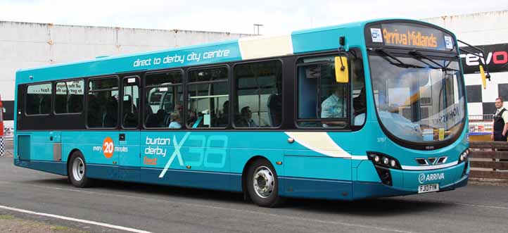 A year later, seen arriving at SHOWBUS 2013 at Long Marston is Arriva Midlands Wright bodied VDL SB200 3767 (FJ13FYM) lettered for the X38 between Burton and Derby jointly operated with Trent. The VDLs have displaced Optare Versas from the route. Picture reference 5412