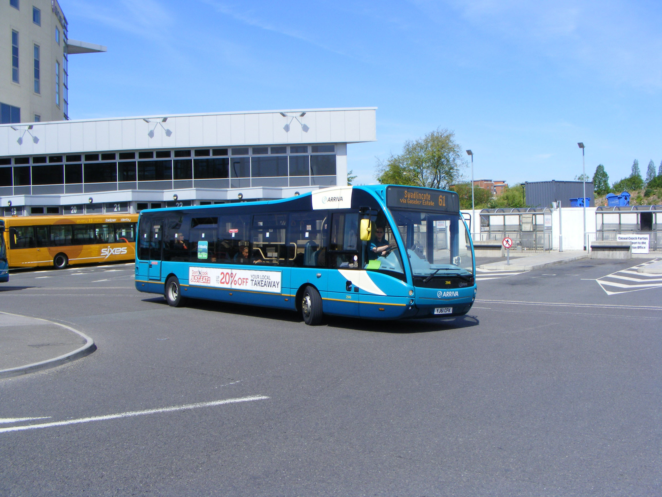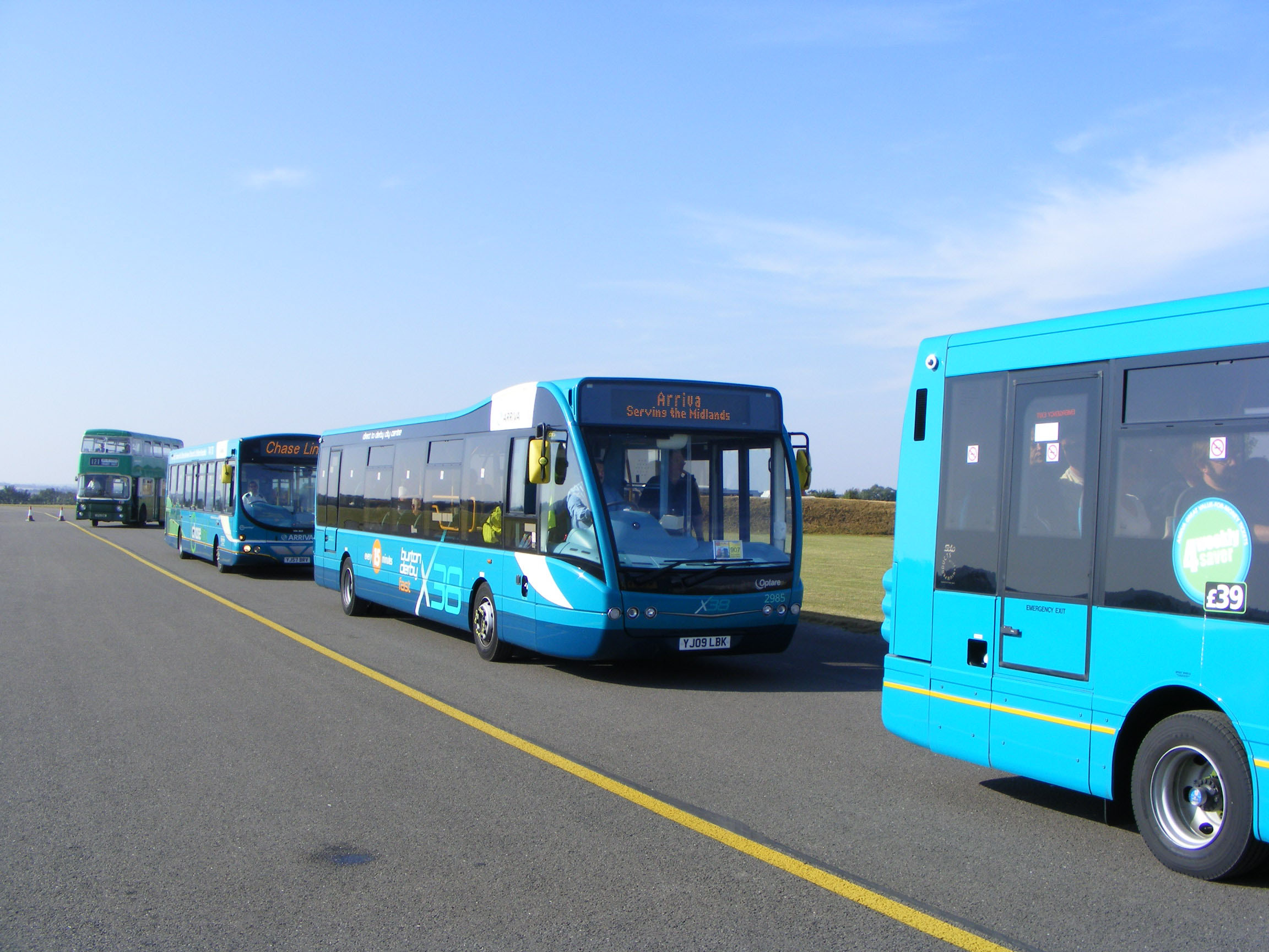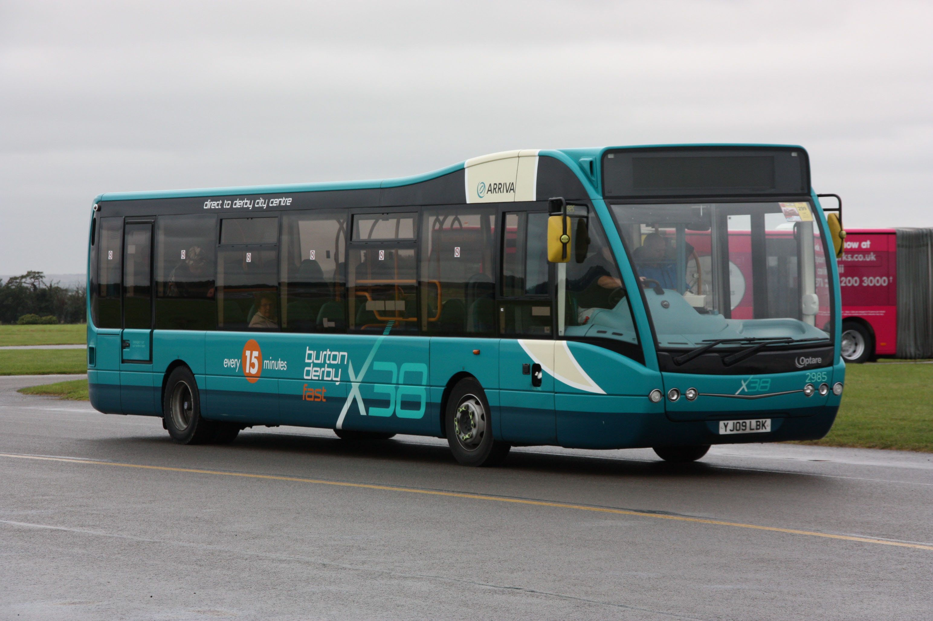 The Optare Versa itself has had a widespread success and can be found in several Arriva fleets and beyond. Arriva Midlands has taken a particular liking to them. Here 2985 (YJ09LBK) is branded for the Derby - Burton X38 service pioneered by Stevensons. It is seen arriving at SHOWBUS international 2009. |