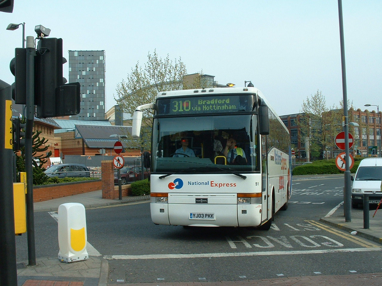 Wending its way to Bradford via Nottingham and Leeds is on National Express work is Birmingham Coach Company's 15 (YJ03PKK), a Van Hool Alizee T9 bodied DAF SB4000, seen in Leeds in April 2007.