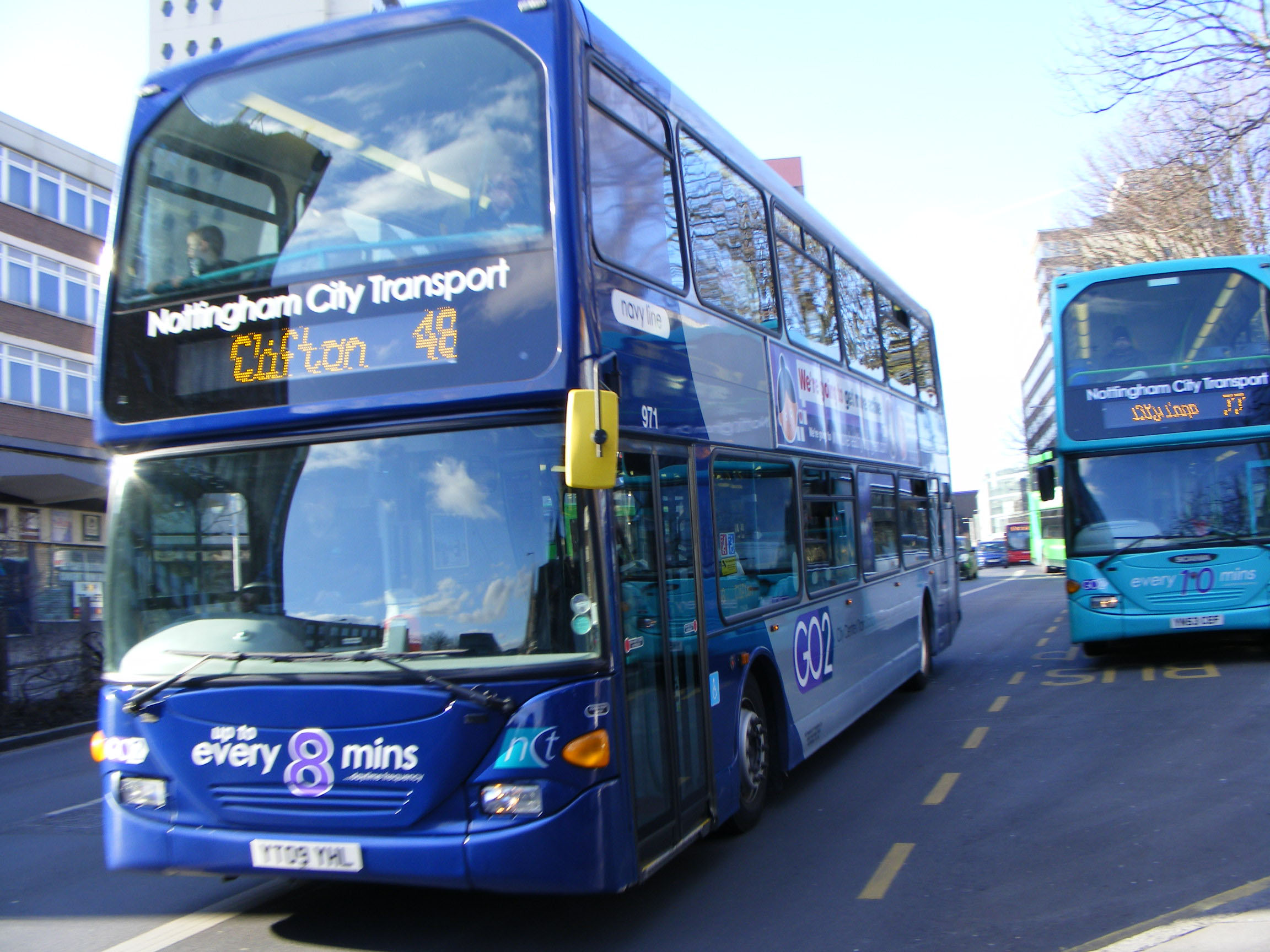Whether you would get sea sick on these Scanias on the Navy Line is a matter of conjecture. The Clifton Estate 48 route, once shared with South Notts makes the colour choice obvious. East Lancs bodied N270UD Omnidekka 971 (YT09YHL) leaves the city for Clifton in March 2010. |