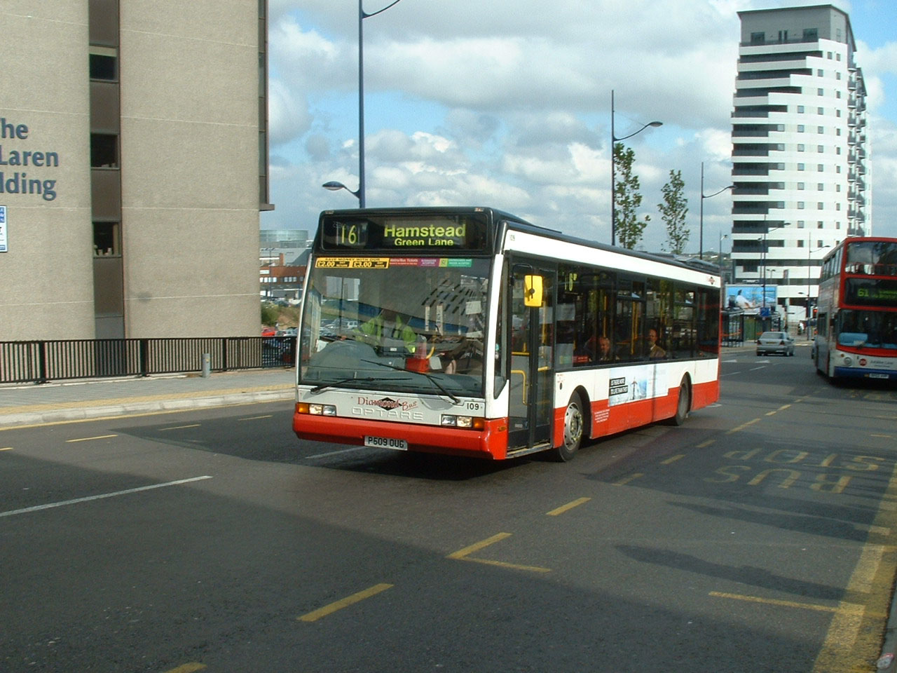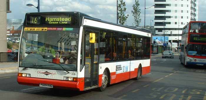 Several Optare Excels were acquired by Diamond Bus including 109 (P509OUG) which was new to Metrobus of Orpington and disposed of by them before both companies were in common ownership.