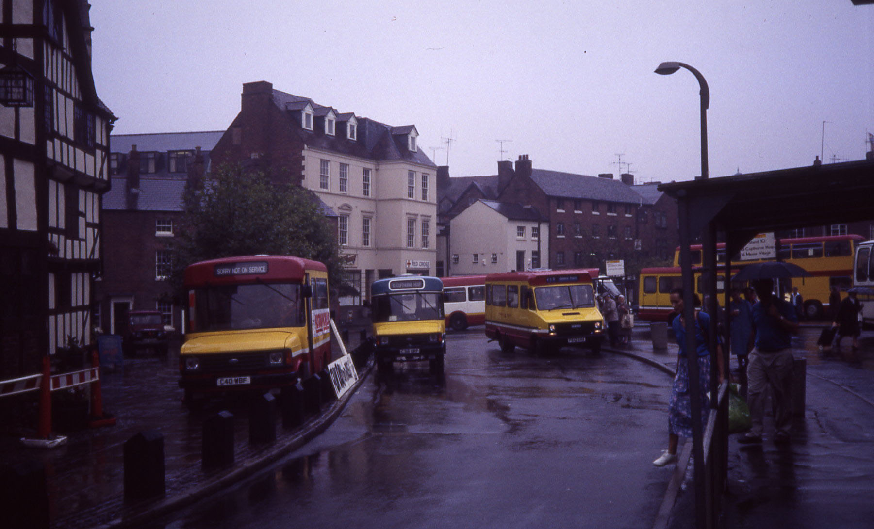 This oversized charabanc from Shamrock & Rambler, was given a suitable mock vintage registration - TR6147 - the vehicle is actually based on a Bristol LH chassis. NBC transferred it to Midland Red and for some reason it was in Shrewsbury in 1989 in the town centre with a passing Carlyle bodied Fiat 49.19 Hotspur minibus, 303 (F603EHA), and a Boulton's coach in the background. |