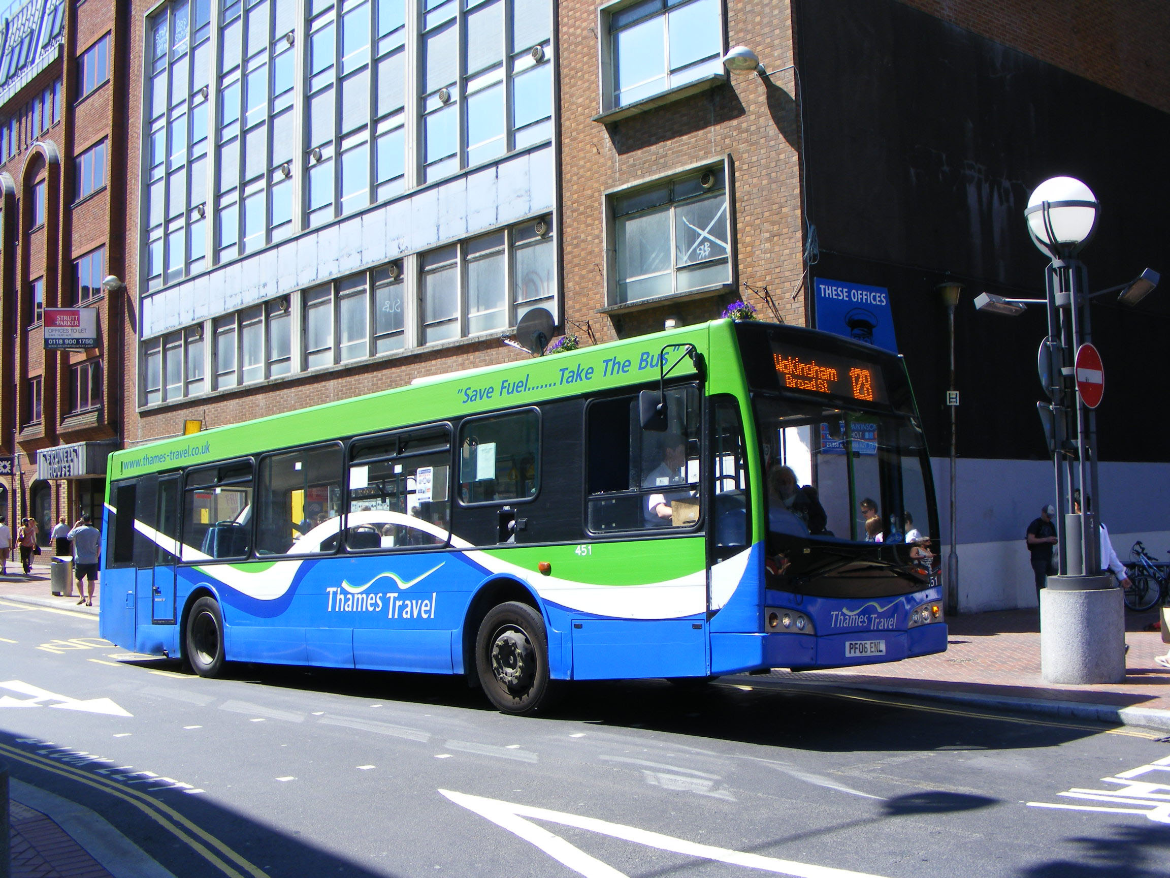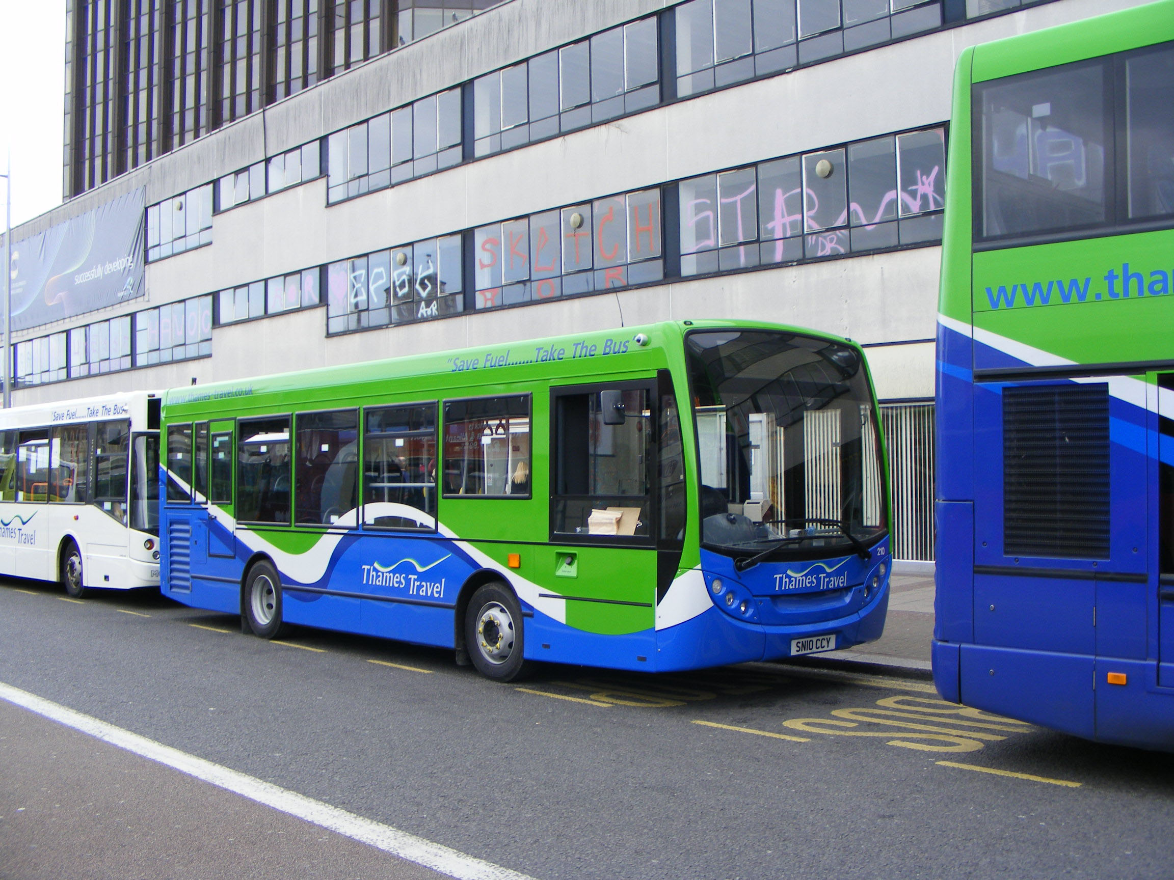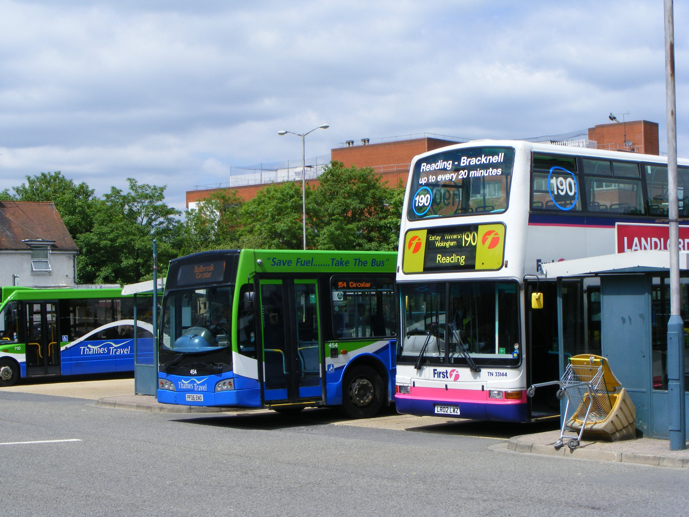 First Berkshire's Plaxton President bodied Trident TN33144 (LR02LWZ) new to First in London is seen with Thames Travel's East Lancs bodied Scania N94UB 454 (PF06ENO) and one of their Optare Solos in Bracknell Bus Station in June 2013. The blue and green invasion did not last long as the company withdrew from the area after tender losses and competition from Courtney Buses. |