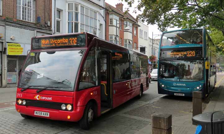 Also from Thames Travel and initially with E&M Horsburgh was 713 (MX58AAN) seen in Watford in later that year in September. The Solos were a popular choice for the 336 from Watford to High Wycombe and an economical choice for Sunday services, particularly the Heathrow A40. Also in the picture is Arriva the Shires Alexander Dennis Enviro400 5458 (SN58EOE). Picture ref A5124 |