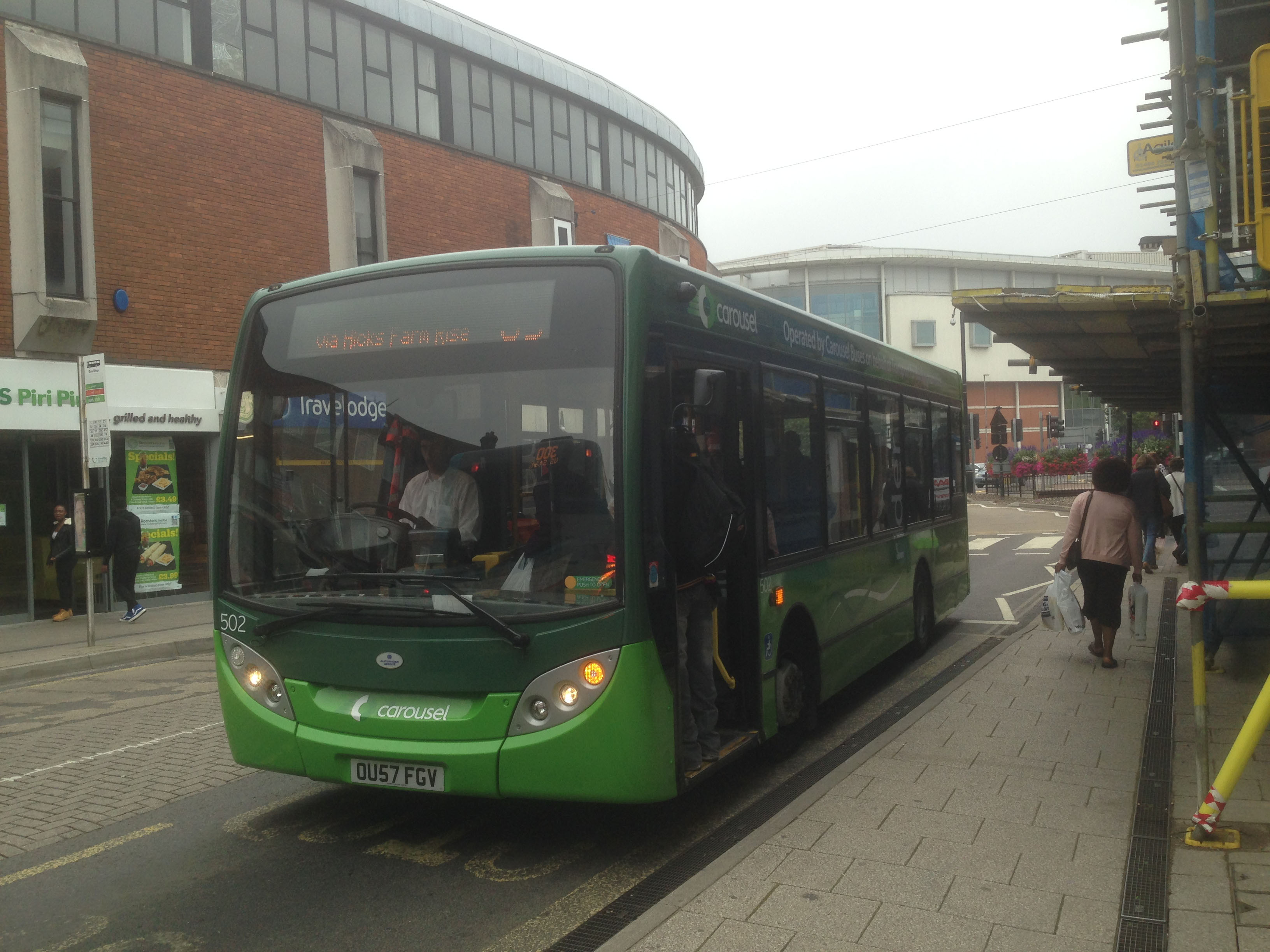 Another Oxfordshire migrant to High Wycombe was Alexander Dennis Enviro200 502 (OU57FGV) painted in Bucks County Council County Rider green livery. It is however unusually doing a turn on Wycombe town Orange Route 39 to Hicks Fram Rise, normally the preserve of two orange painted Alexander Dennis Enviro200 bodied MAN.