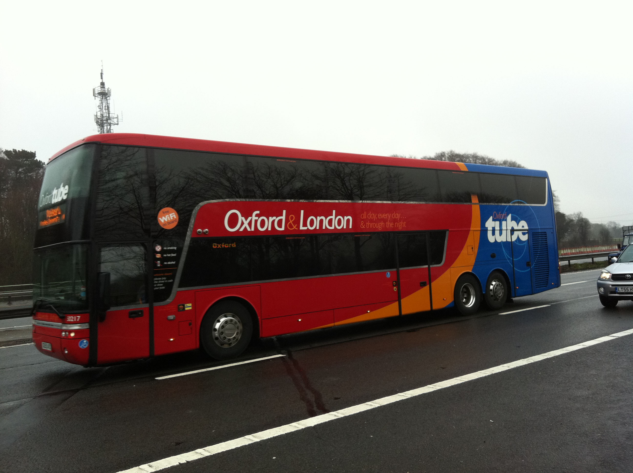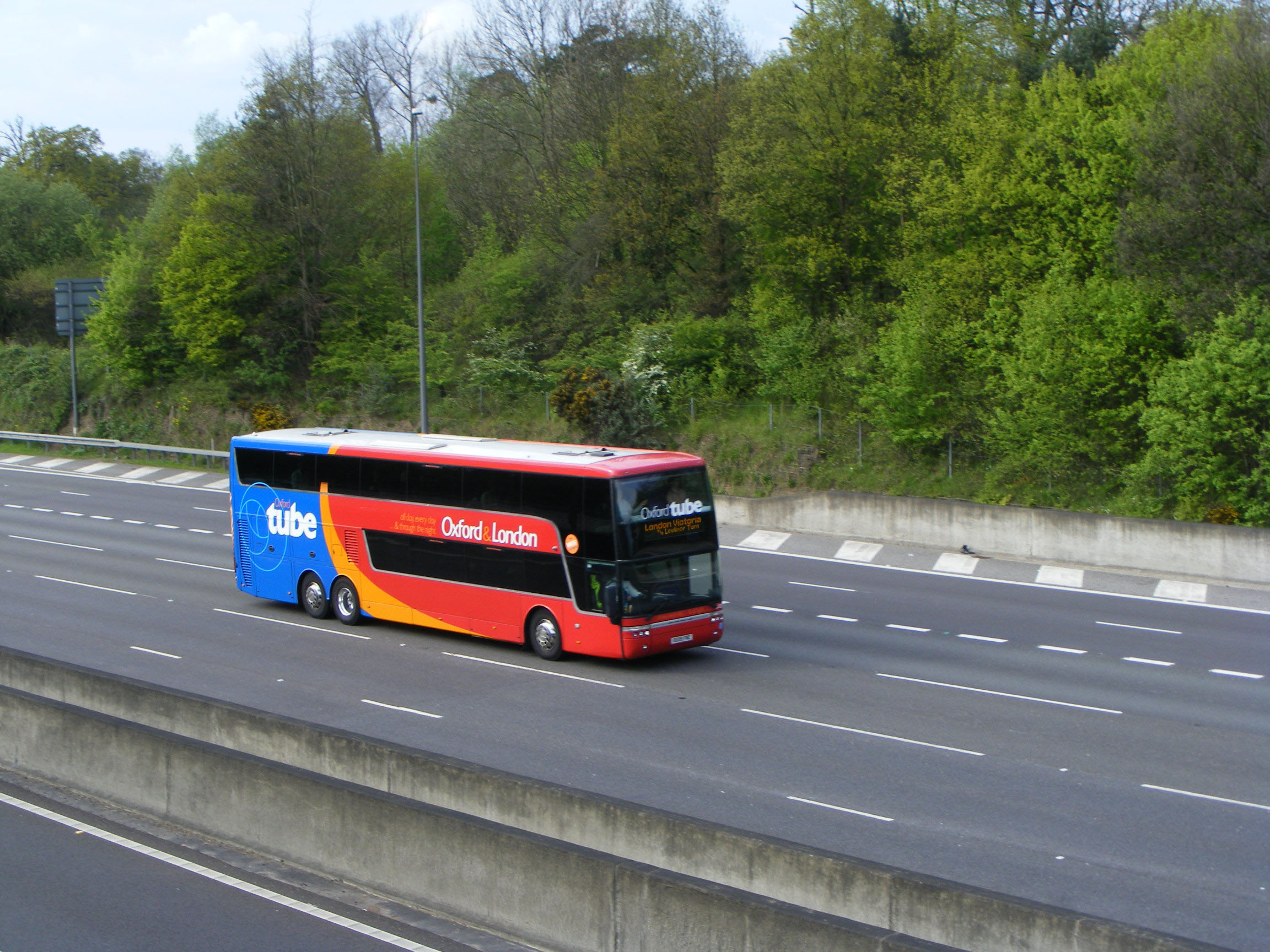 New for the Oxford Tube in 2009 was a fleet Van Hool Astromega TD927 doubledeck luxury coaches, a far cry from the Mercedes minibuses once used. Seen here on the M40 in April 2011 is 50216 (OU59AVC), one of the fleet of 26 which displaced the Neoplans after five years loyal service.