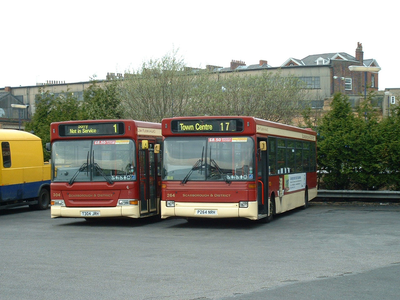 The Plaxton Pointer body originated with the manufacturer's Reeve Burgess subsidiary. It was adapted for the low floor Dart SLF in the version seen on the right for Scarborough & District's 264 (P264NRH). Ogle assisted in a redesign of the body to produce Pointer 2 as seen on 304 (T304NRH). Both buses were seen together in Scarborough in April 2007.