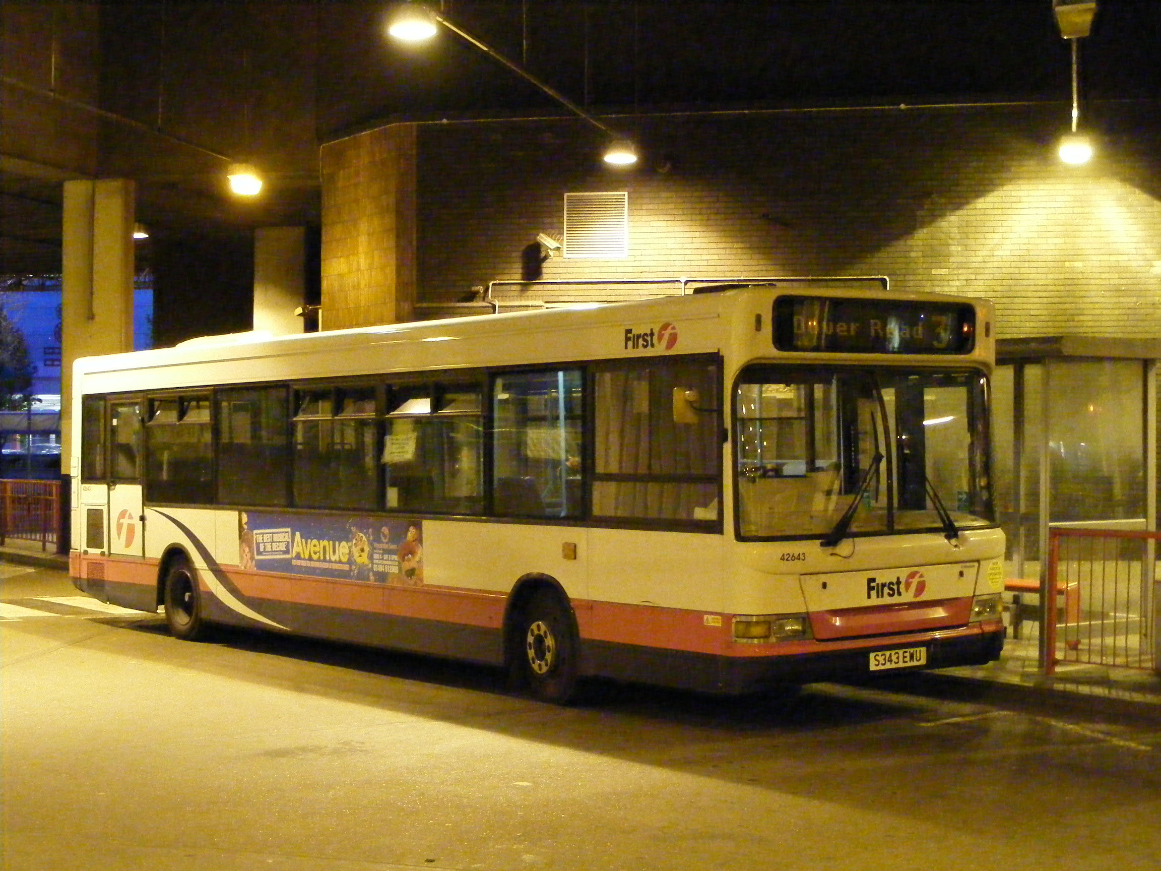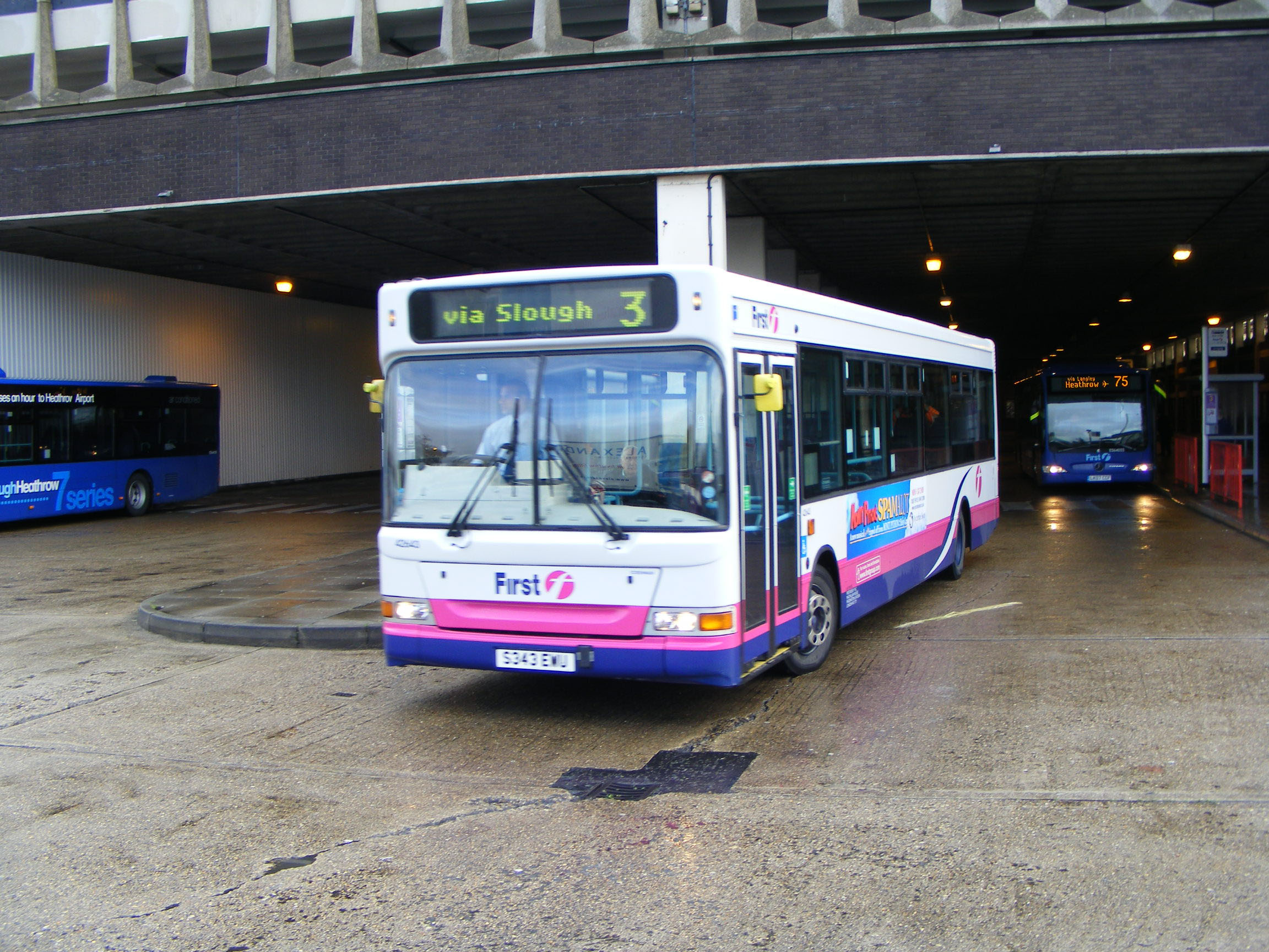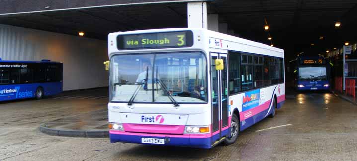 Delivered the following year, this normal length Dart SLF, 42643 (S343EWU) was transferred south to First Beeline. It is seen leaving Slough Bus Station in October 2010 in the company of a pair of the blue liveried Citaros used on Heathrow services. | |