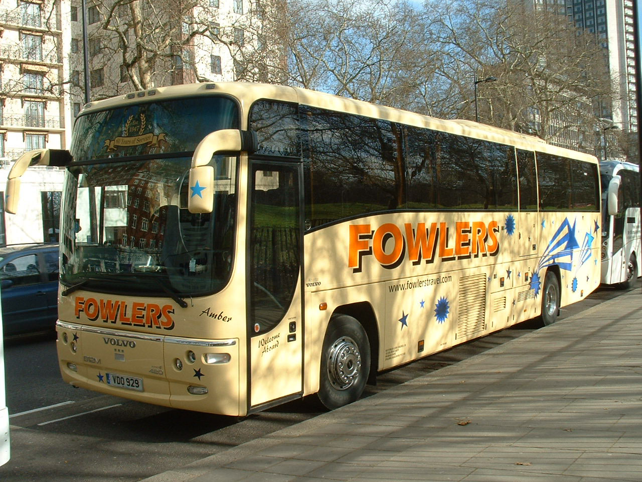 This March 2008 view of Plaxton Paragon bodied Volvo B12M VDO929 is believed to be in the capital. The coach has been named Amber. As may be noted the livery treatment involves blue stars and if you have been looking carefully you will have struggled to find two Fowler's coaches in identical liveries, the company enjoying giving their vehicles individual identities but still using the company colours.
