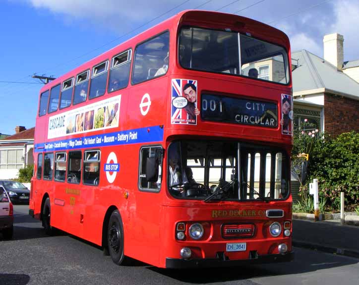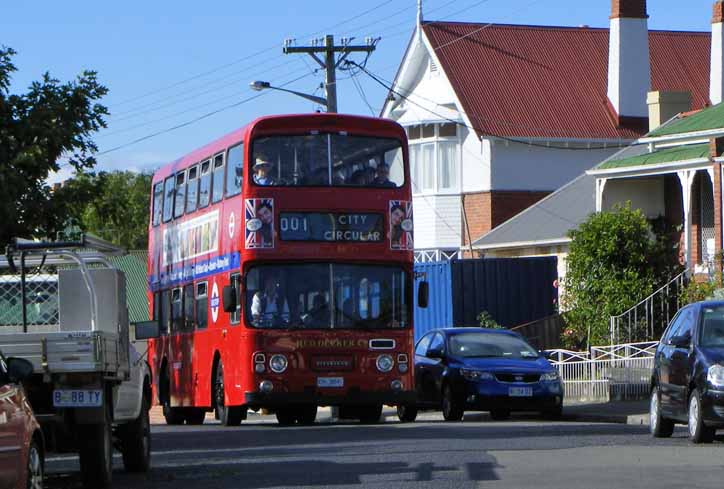 Two Hobart Red Decker Atlanteans together in the city centre. Backing up 302 was former Sydney Buses PMC bodied Leyland Atlantean, 303 (FC8993) which arrived in Tasmania via Toronto Bus Service. Both buses have since been replaced by a Hobart Explorer branded Anhui Ankai doubledecker open topper and a former Fantastic Aussie Tours closed top MCW Metrobus D35QG, originally London Metrobus M450 |