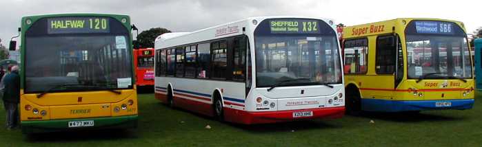 The 2000 Traction group display at Showbus was a presentation of three identical DAF SB220 buses with East Lancs Myllennium bodies. From left to right we have Yorkshire Terrier 477 (W477MKU), Yorkshire Traction 213 (X213HHE) and Road Car Super Buzz 856 (X856HFE).