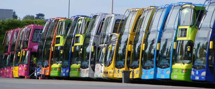 Calling by Reading Buses depot on Tuesday this week around 7.30pm a kaleidoscope of colours presented themselves in this line up of buses being cleaned ready for service the following day. The upright "Green Bus" Optare Spectras stand out amongst the more relaxed East Lancs Scanias and one Enviro hybrid.
