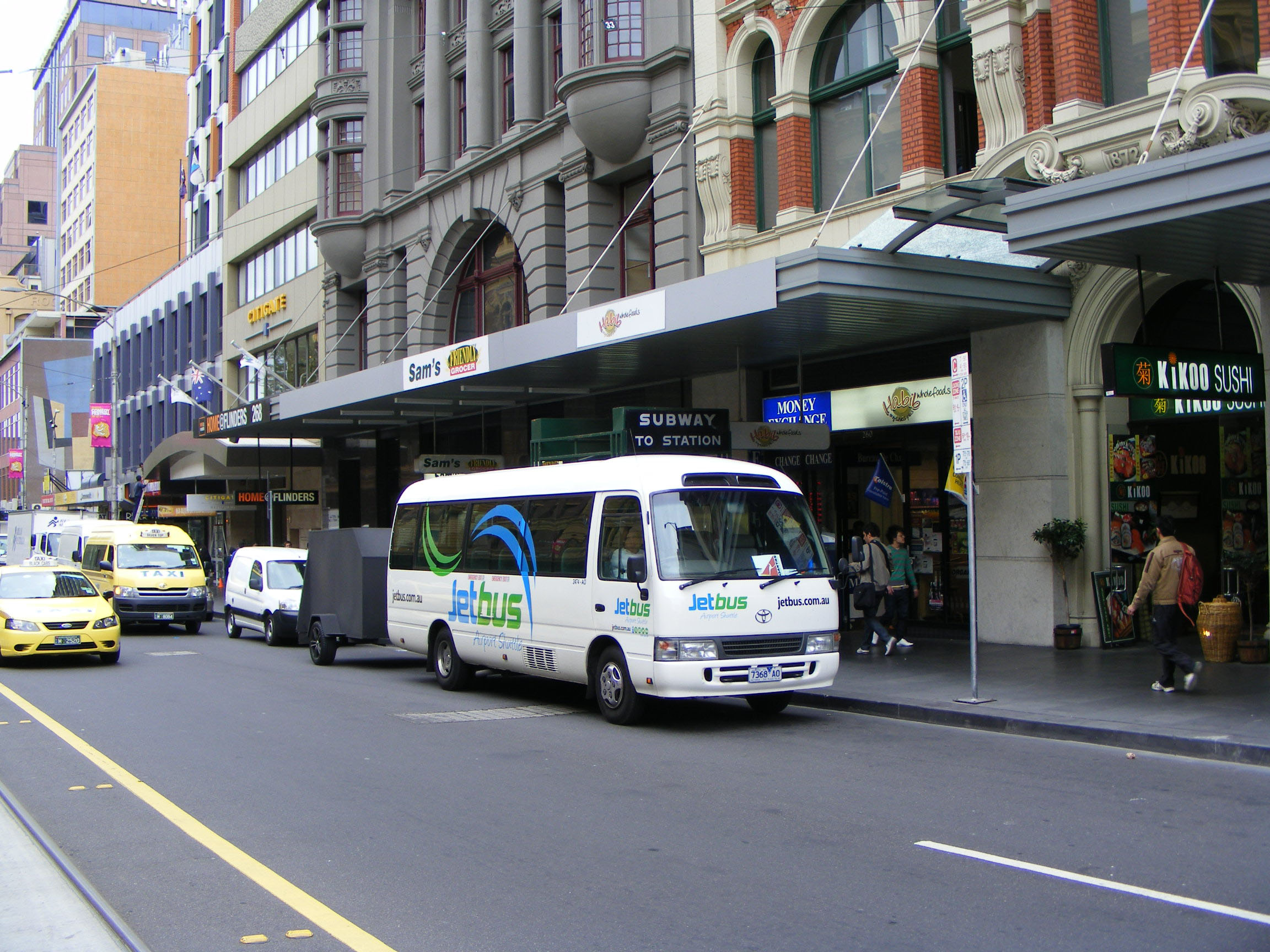Before the advent of Skybus Jetbus linked downtown CBD hotels with the Airport at Tullamarine, where their bus fleet was based. Unfortunately the company's service was not the best, with tales of missed flights and no-show buses. When Skybus came along it was the beginning of the end. They offered fast regular services from the Airport to the city and a fleet of smaller buses for hotel transfers, though this additional service disappeared around COVID time if not before. Typical of the Jetbus fleet was this 1988 Hino Rainbow, 3134AO, seen outside the Holiday Inn in April 2010. |