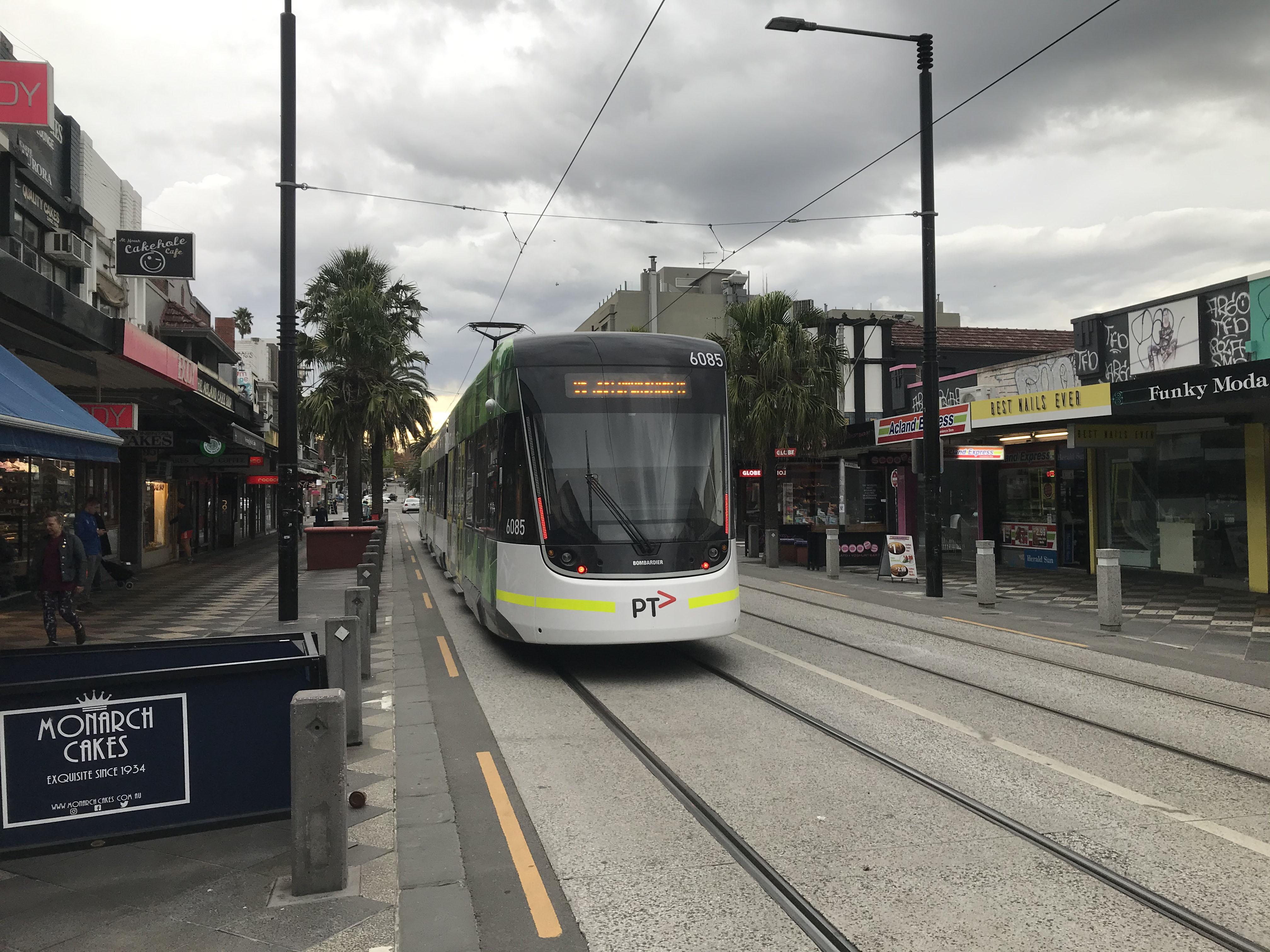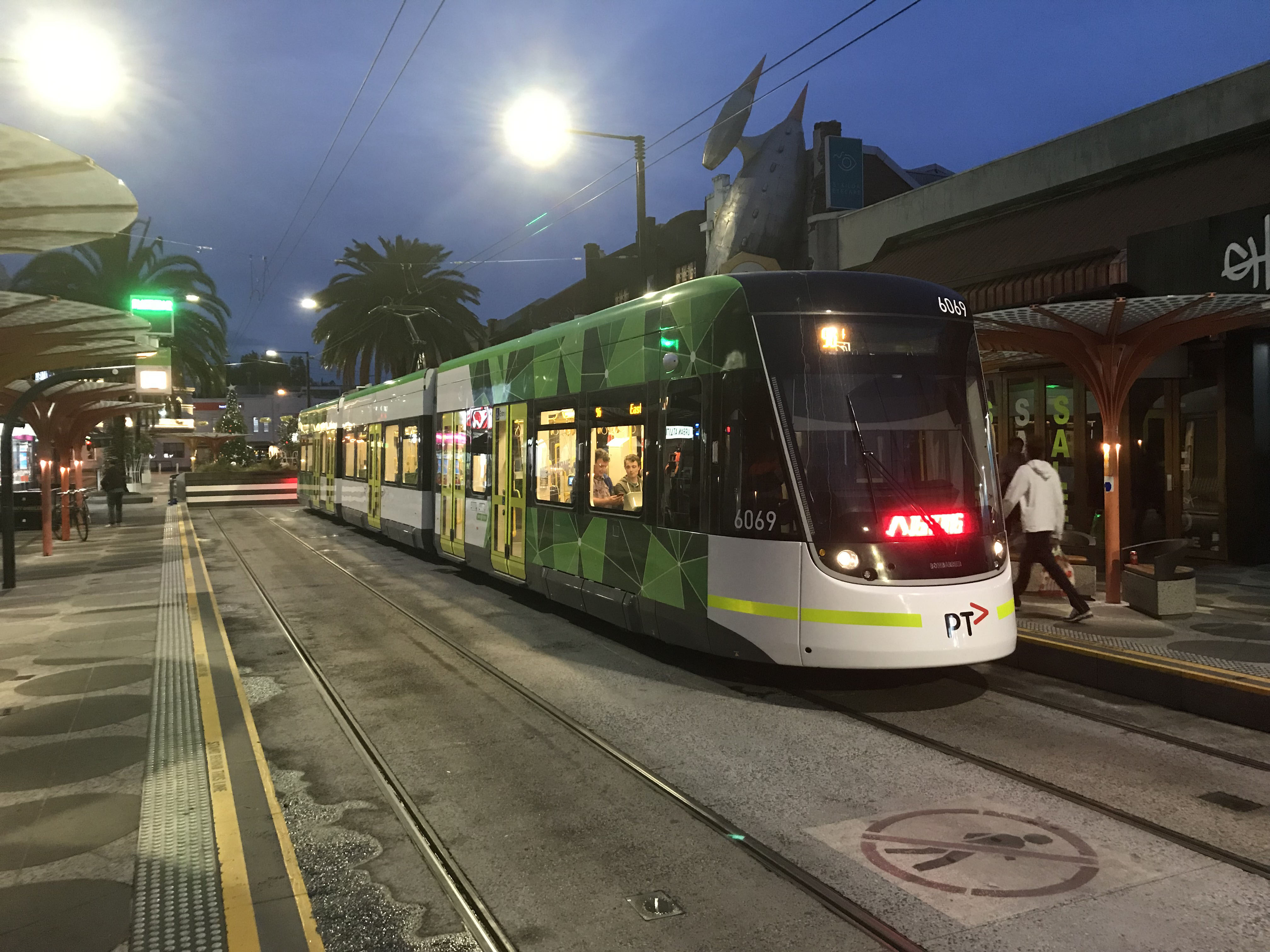 Car 6069 awaits an evening departure for East Brunswick in Acland Street in November 2018.
