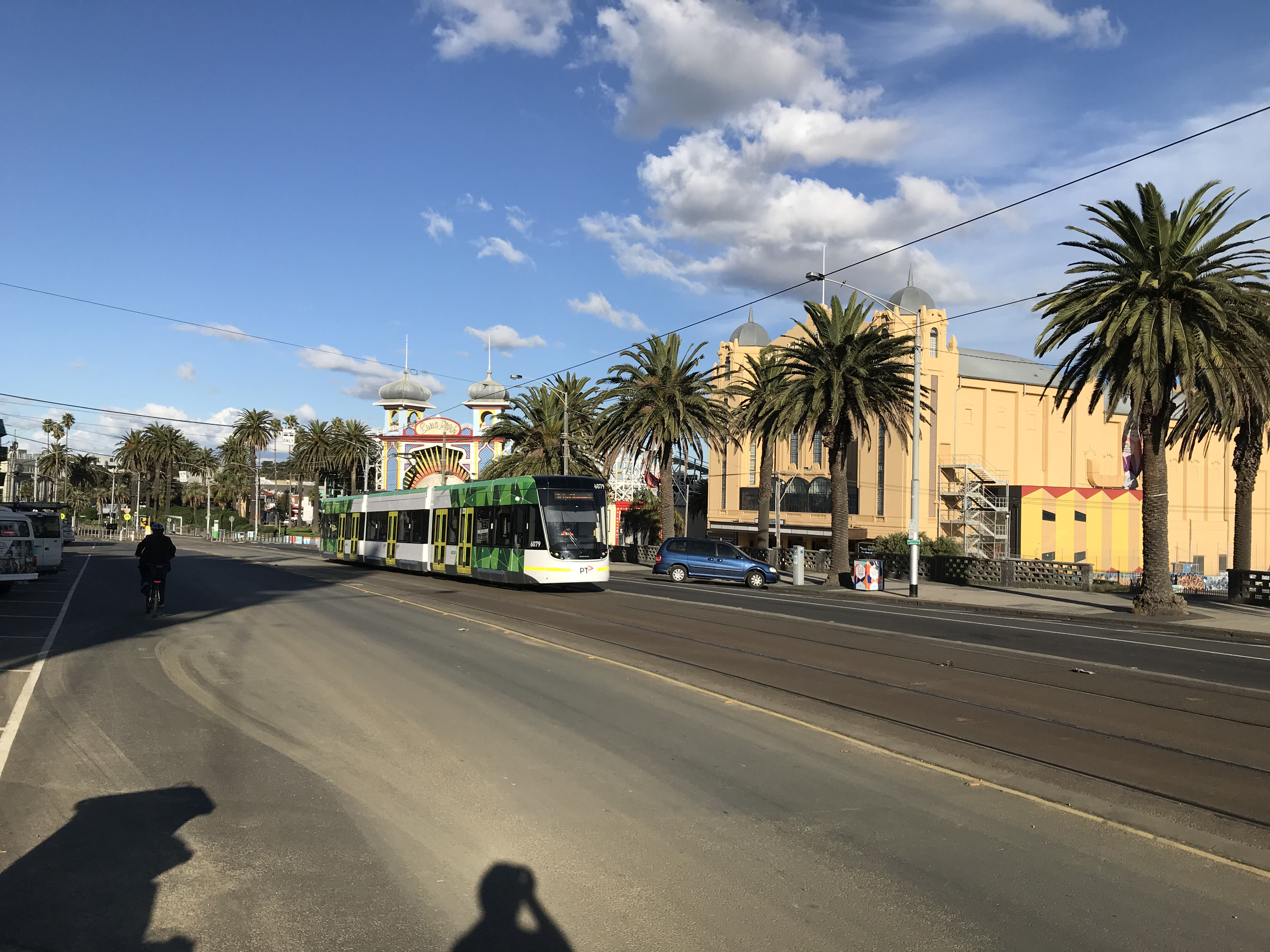 Lovely sunshine that month as 6079 passes the Palais Theatre and Luna Park as it heads for a desolate city.