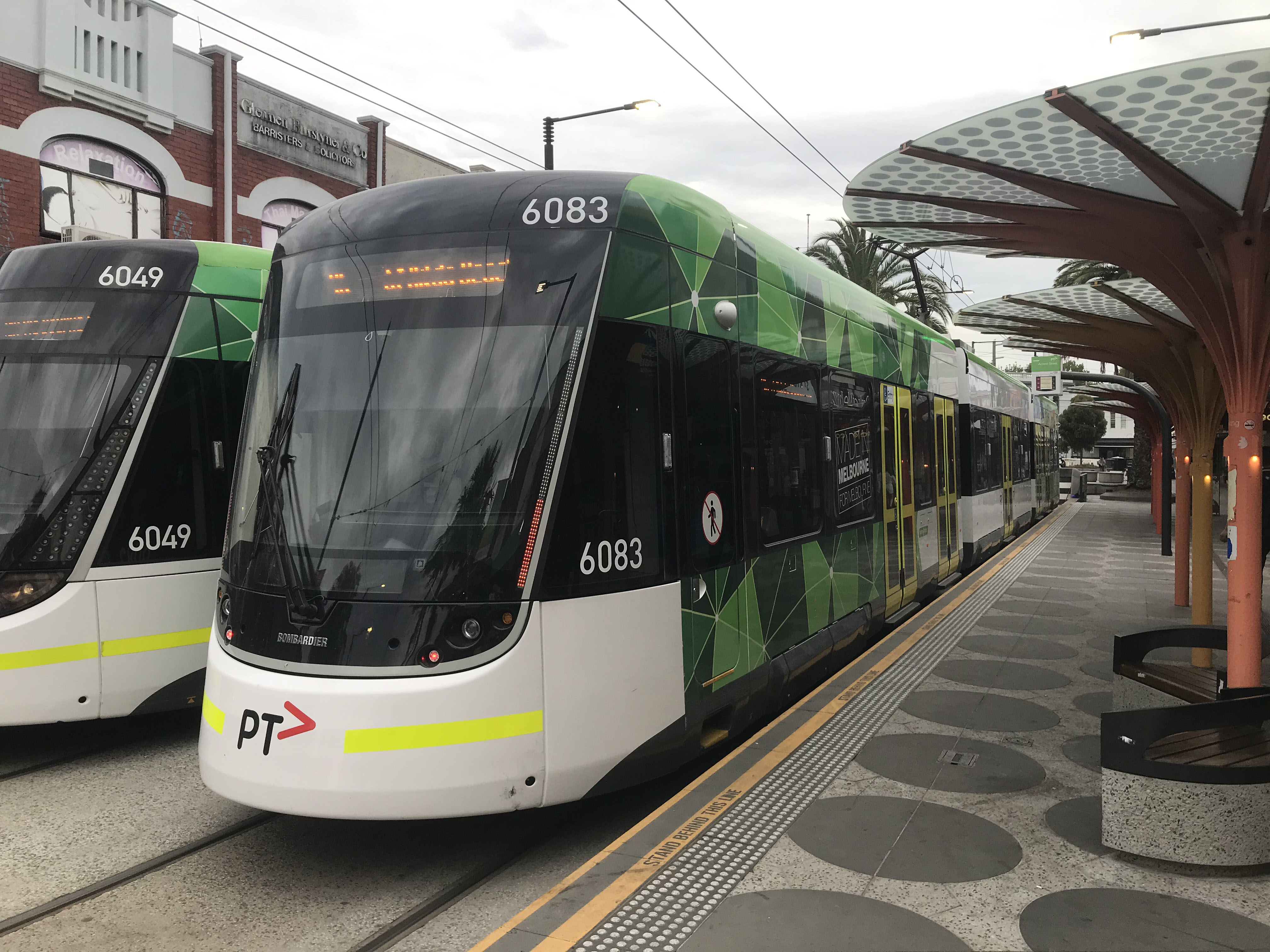 Seen passing at St Kilda Station in February 2025 are 6060 and 6070, the latter in a wrap for Commonwealth Bank. Since new the Bombardiers had been excluded from the city's thirst for all over advert trams, but apart from a couple "that got away" things suddenly took off in 2025 with advertisers eager to get an E-class wrapped!