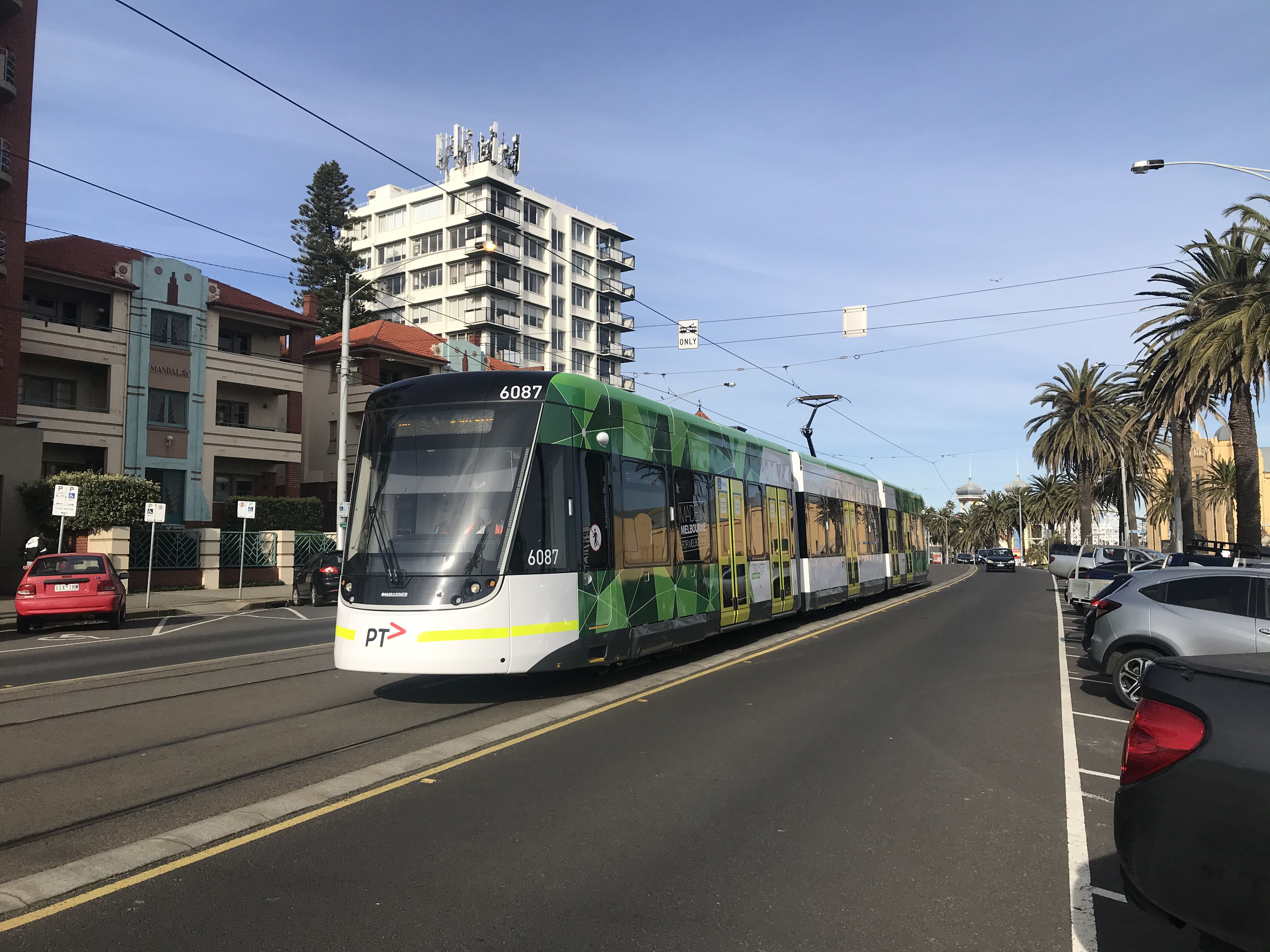 A nearside view of 6087 on St Kilda Esplanade, city bound, later in November.