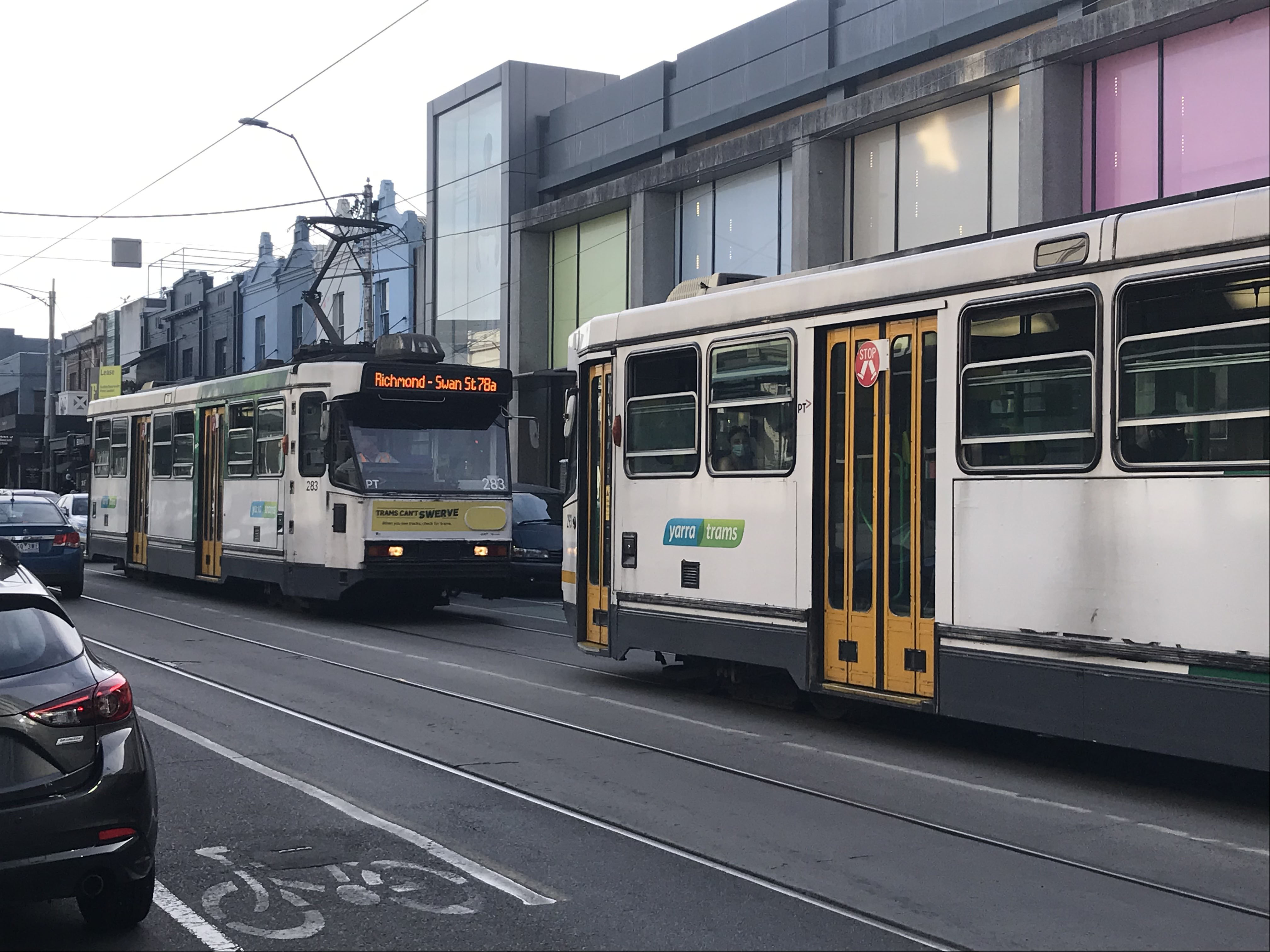 Two cars meet on Chapel Street in Prahran with 283 on a 78a terminating at Swan Street. Note the mask wearing passenger in the forward tram heading all the way to the North Richmond terminus.