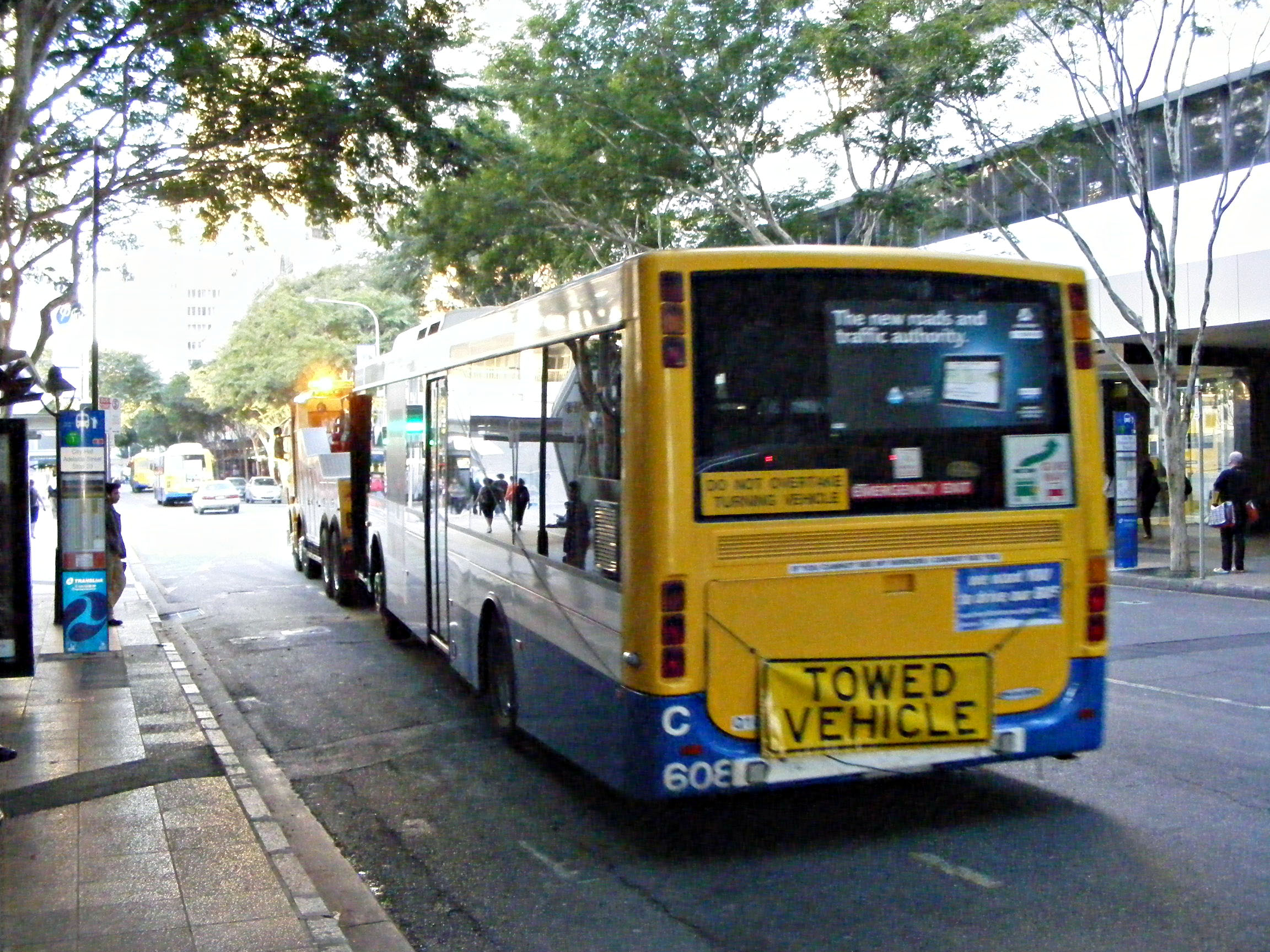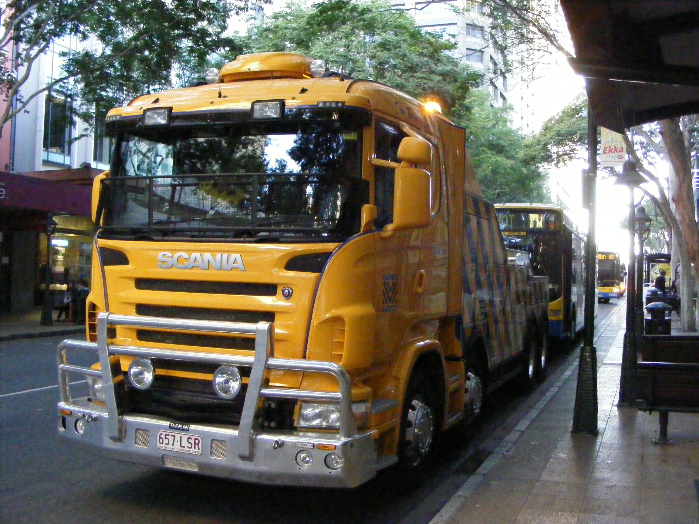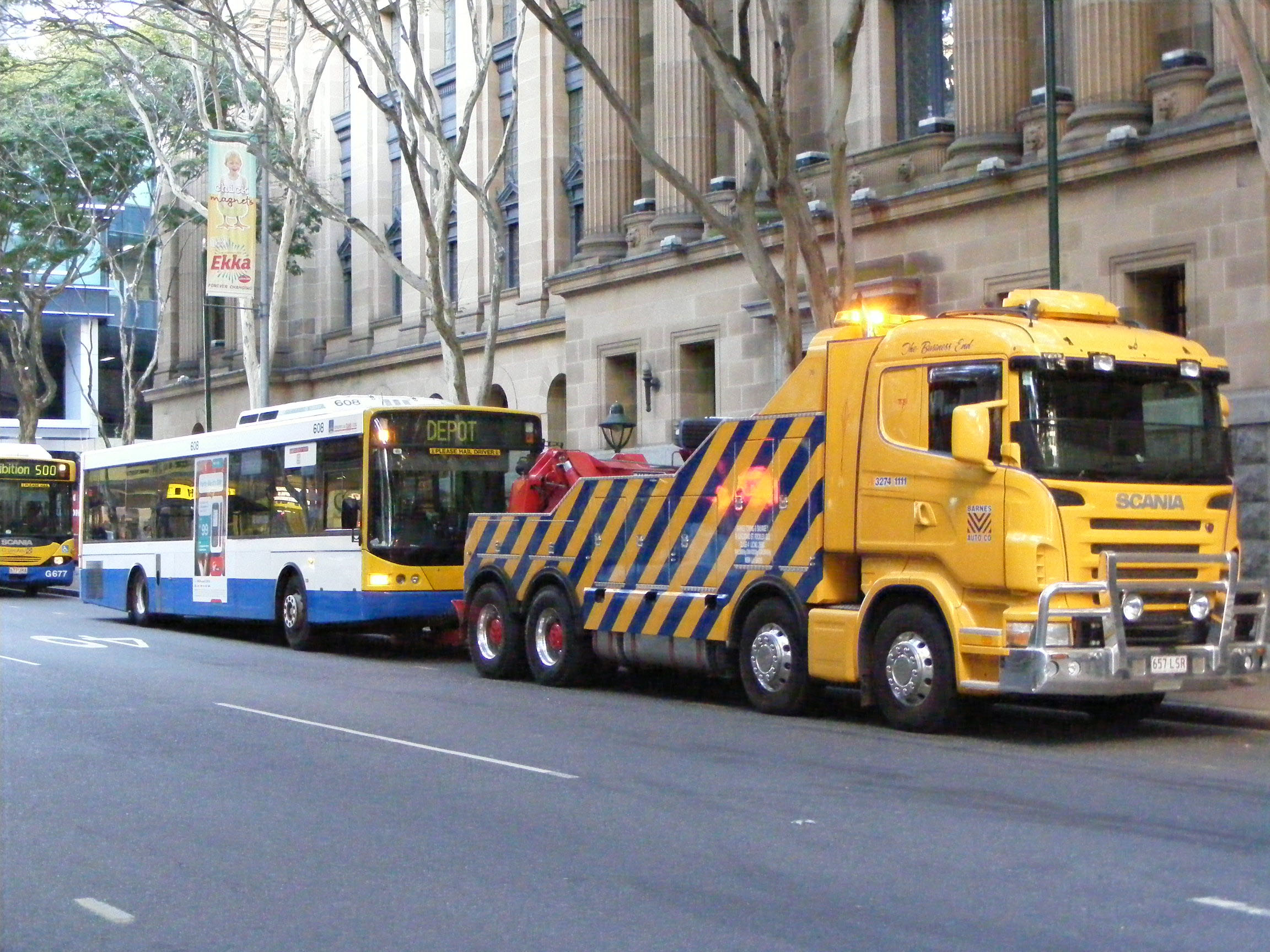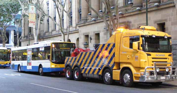How much use this powerful Scania tow truck gets in the Brisbane fleet is unknown, but it is probably an essential piece of kit for promptly dealing with breakdowns and consequent blockages on the city's busway network. Here it is Adelaide Street on August 8th 2009 to remove Mercedes 608, which had disgraced itself whilst operating the free service to the Ekka.