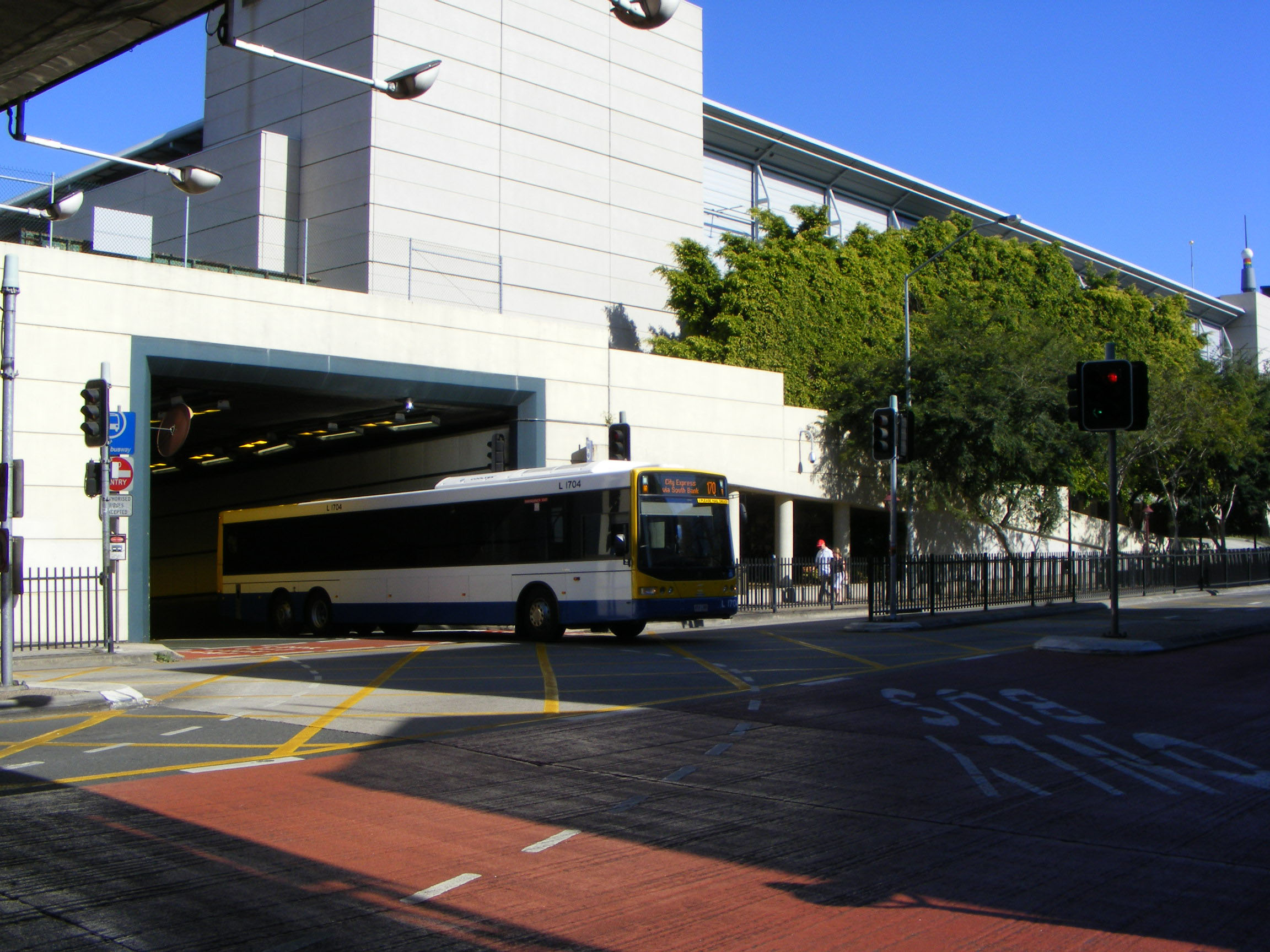 A batch of just eight of these extra long (14.5m) triaxle Scania K310UB entered service in April 2009. The bus, L1704, is seen emerging off the busway on the South Bank in August that year. The buses seat 54.
