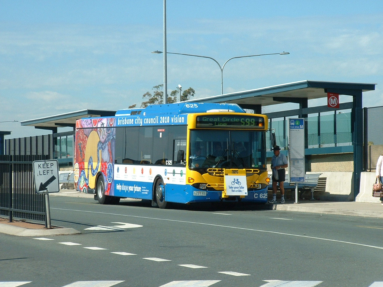 First of the batch of Scania L94UB buses with Volgren CR224L bodies was 625 (625FRX). It is seen on the Great Circle Line route, 599, at the Bus Station atop the Busway at the Garden City interchange. Note the American style bike rack on the front dash - a feature which did not get adopted on the rest of the models.