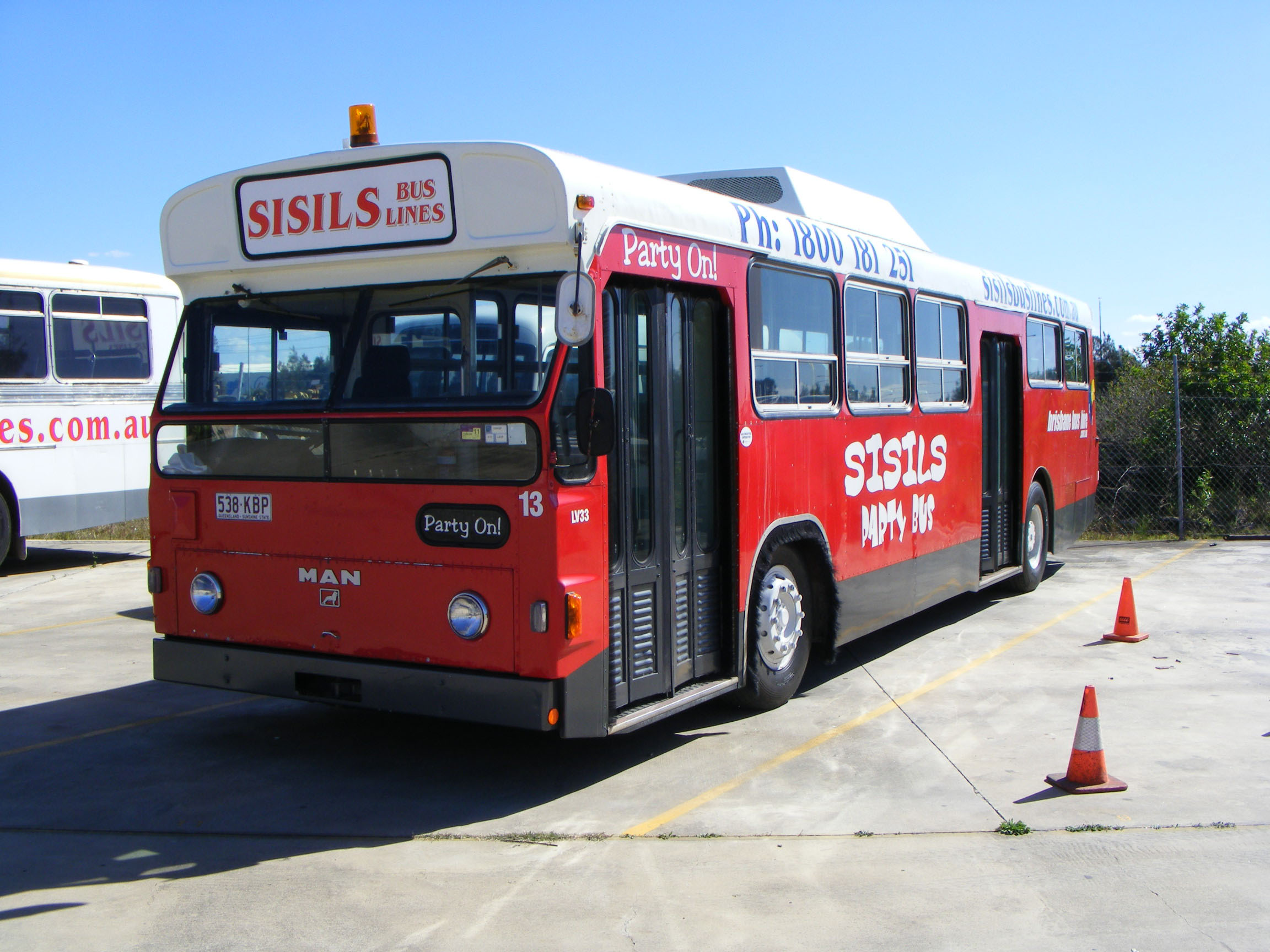 Former Brisbane City Council 913 (913BXJ & 913ORB) was anther Party Bus acquired from Peter Champion Mining in Mackay. Sisils 13 (538LBP) is a Denning bodied MAN SL200, also carrying number LV33. |