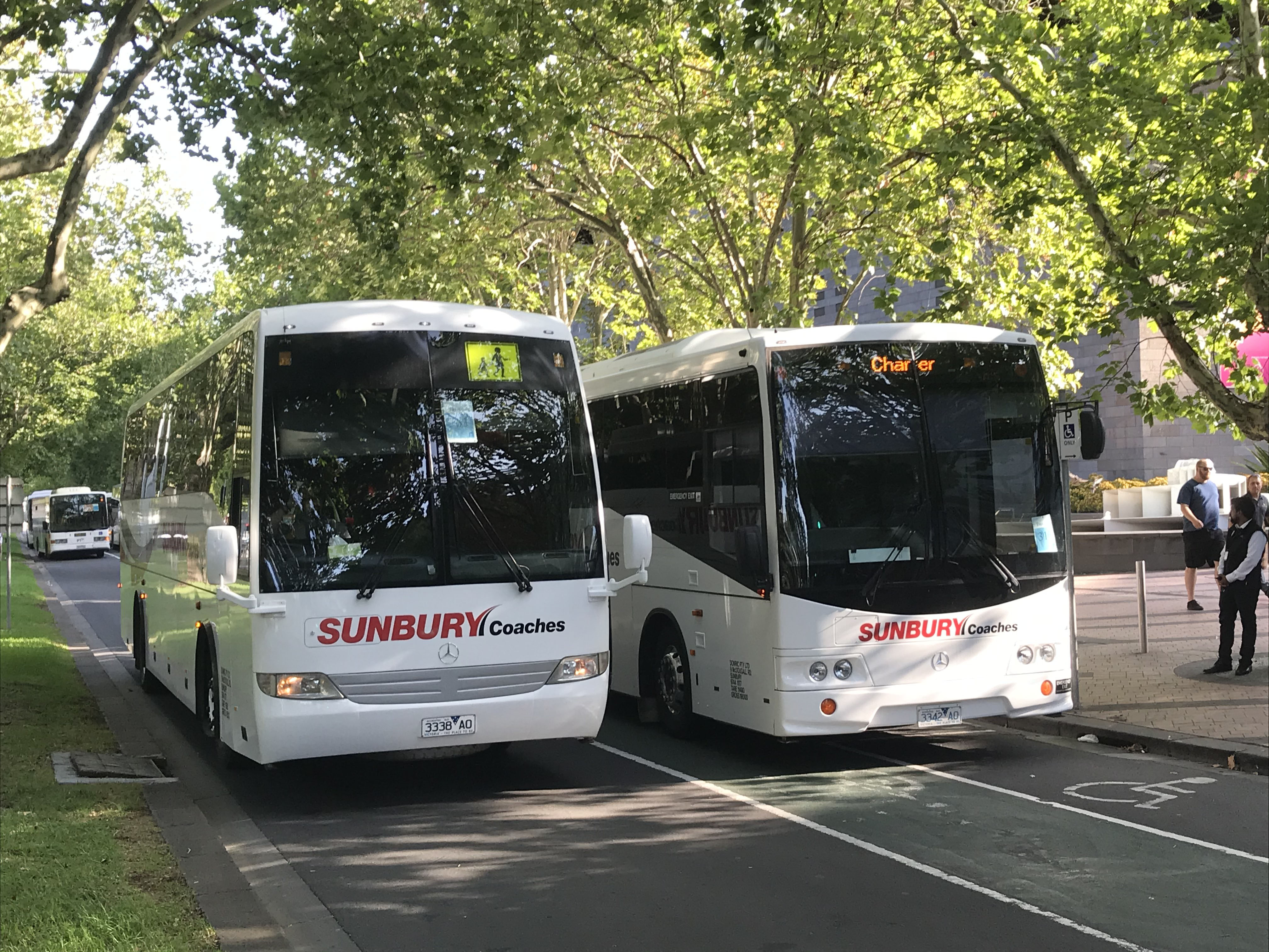 Buslink acquired a large fleet of vehicles for mining contracts in the Northern Territory. Many were sold off at a comparatively young age and snapped up by operators nationwide. Ventura in Melbourne acquired no less than 18 seven or eight year old Mercedes OH1830 vehicles with Volgren SC222 coachwork, similar to others already in its fleet. Like Dysons these were perfect for Victoria's intensive rail replacement services and a trio are seen at work in January 2020 in St Kilda Road's Arts Precinct. This is 1334 (BS04DP), former 101 (MO3514) at the Howard Springs base for the operation.