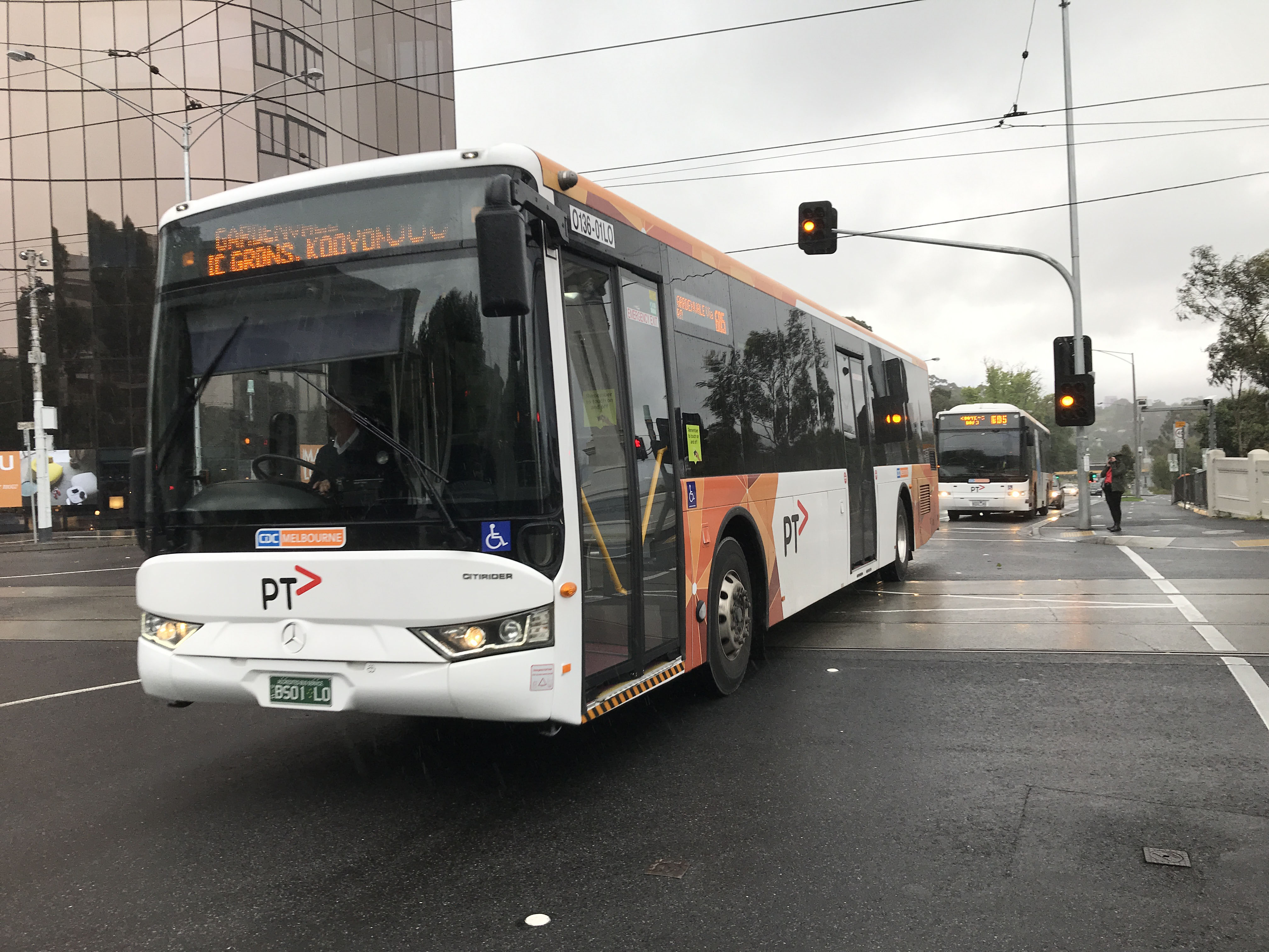 Seen headed to Gardenvale from the city of the 605 in November 2018 is a BCI bodied Mercedes O500LE demonstrator, 136 (BS01LO). The bus is seen in South Yarra crossing the Chapel Street tramlines next to the bridge over the Yarra into Church Street. The bus was also demonstrated to Transdev Melbourne where it was numbered 801, but was acquired for the NSW CDC Charterplus operation as TV1049.