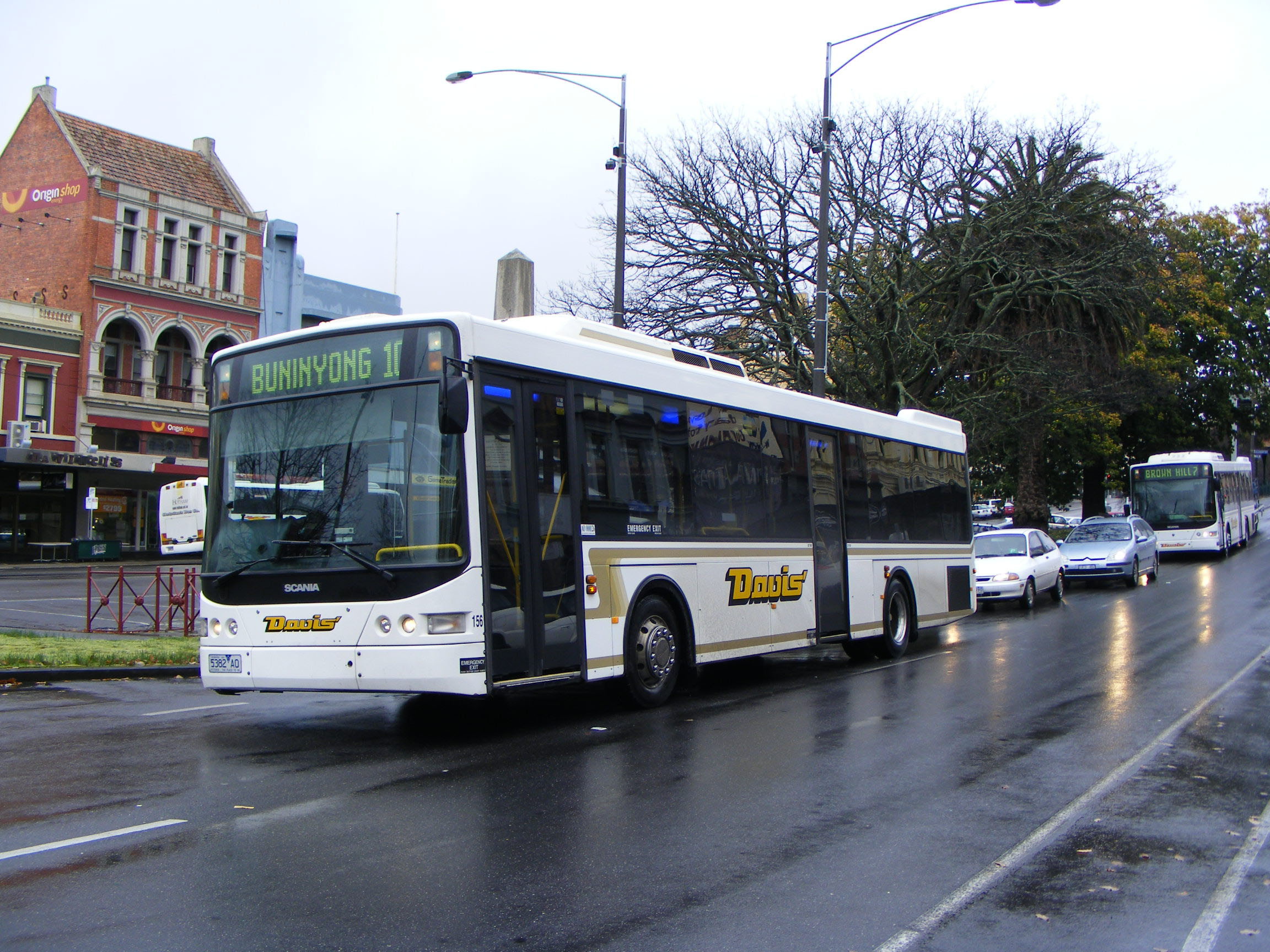 Approaching the bus stands in the town centre is Scania L94UB 162 (5646AO).