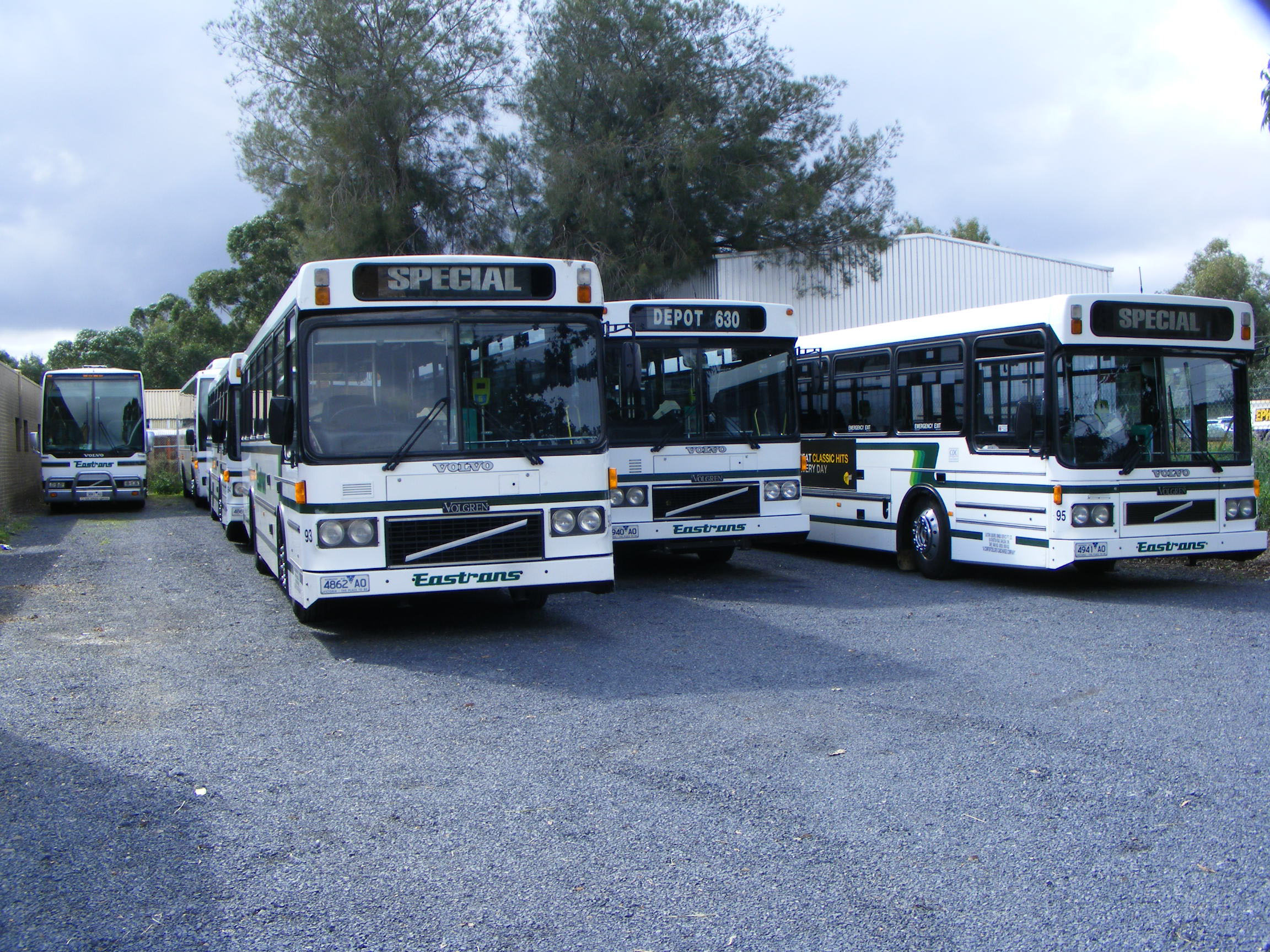 Close to the depot in Atherton Road, Oakleigh, is an overflow yard the other side of Prince's Highway and adjacent to Quince's Scenicruisers. Several B10M/Volgrens were locked in one Saturday in April 2010. From left to right: 93 (4862AO), 92 again and 95 (4941AO). In the backgrond is 102 (3881AO) a Volvo B7R/Autobus ex Coachtrans 267 from the Gold Coast.