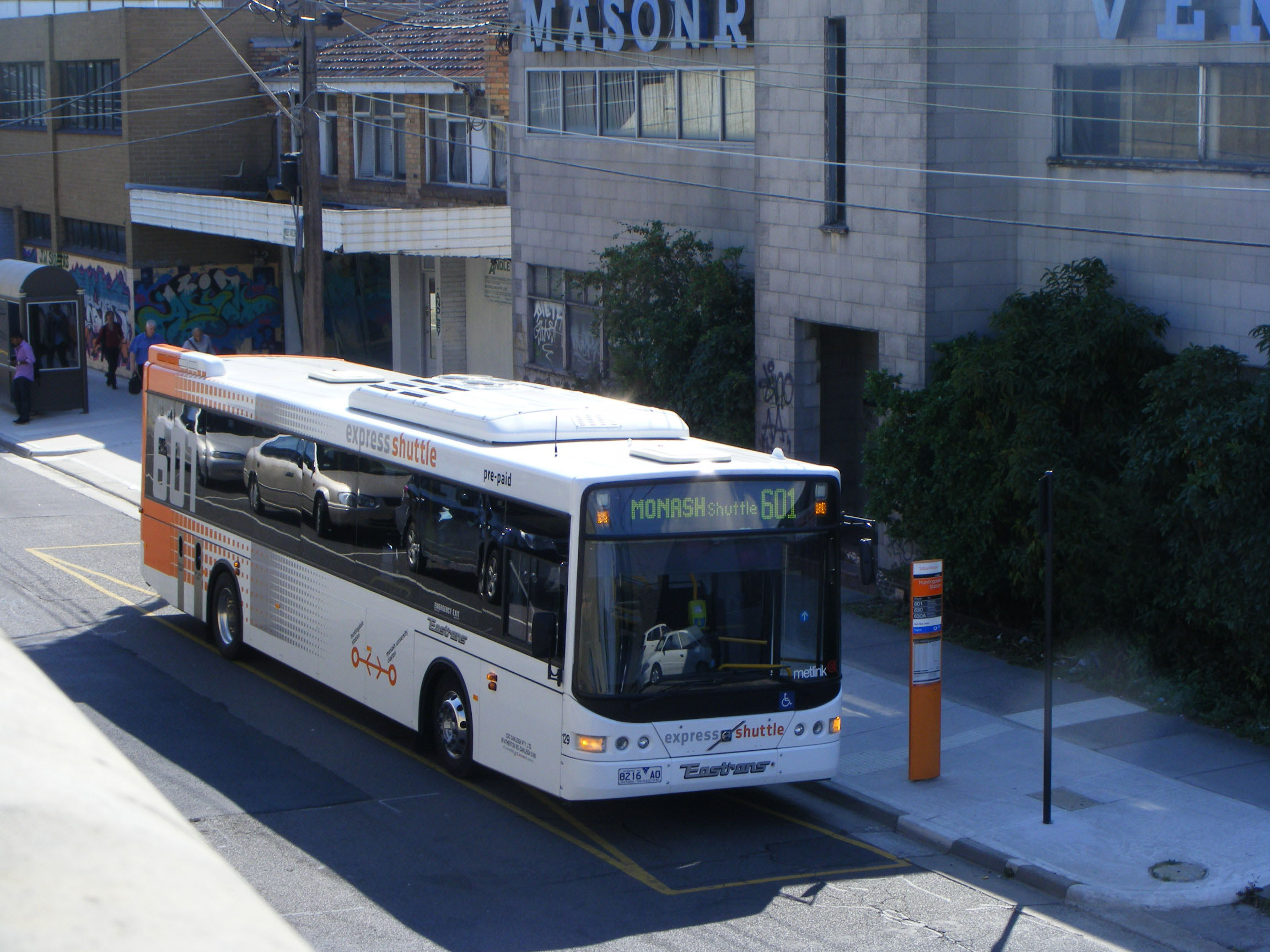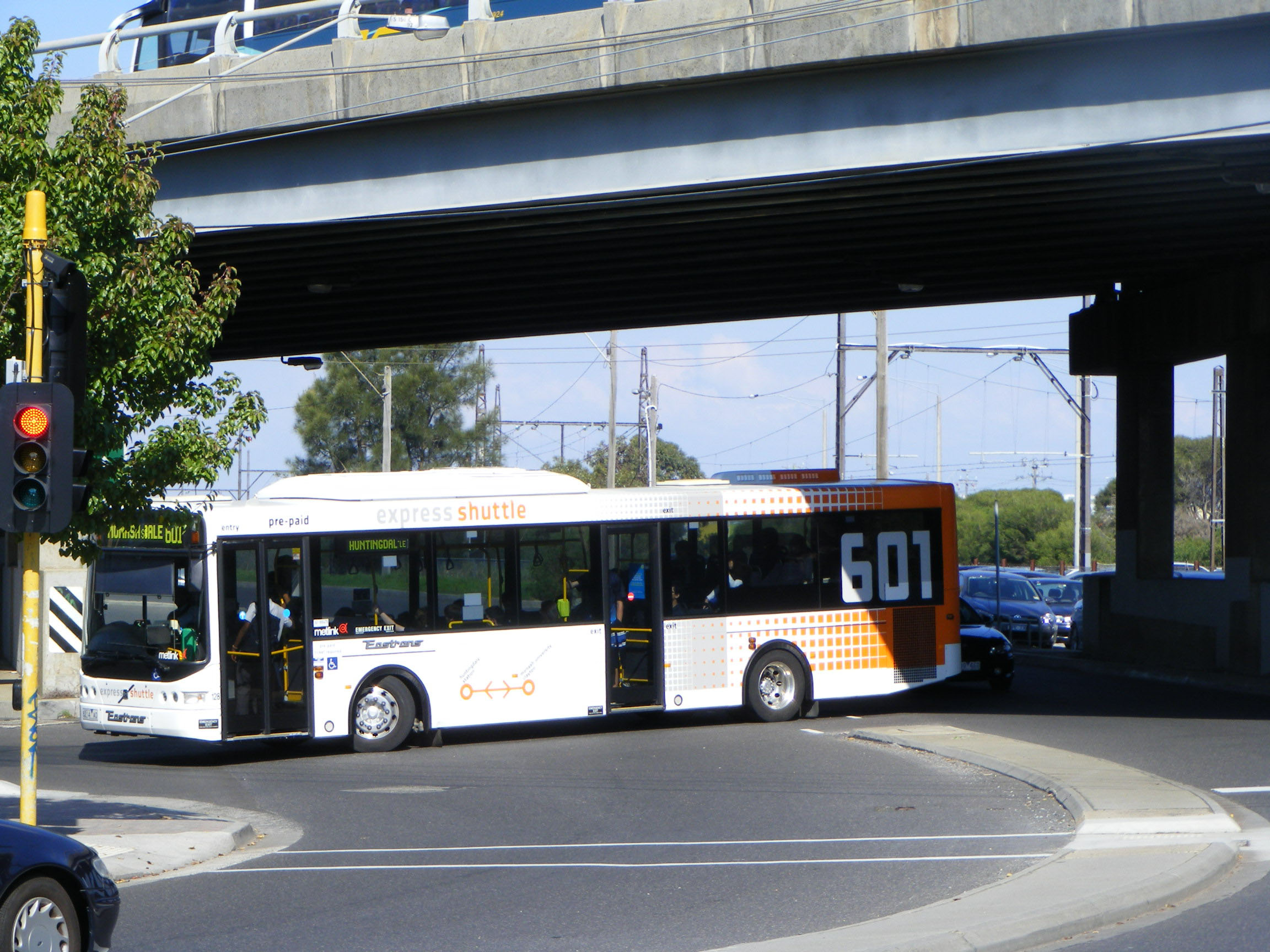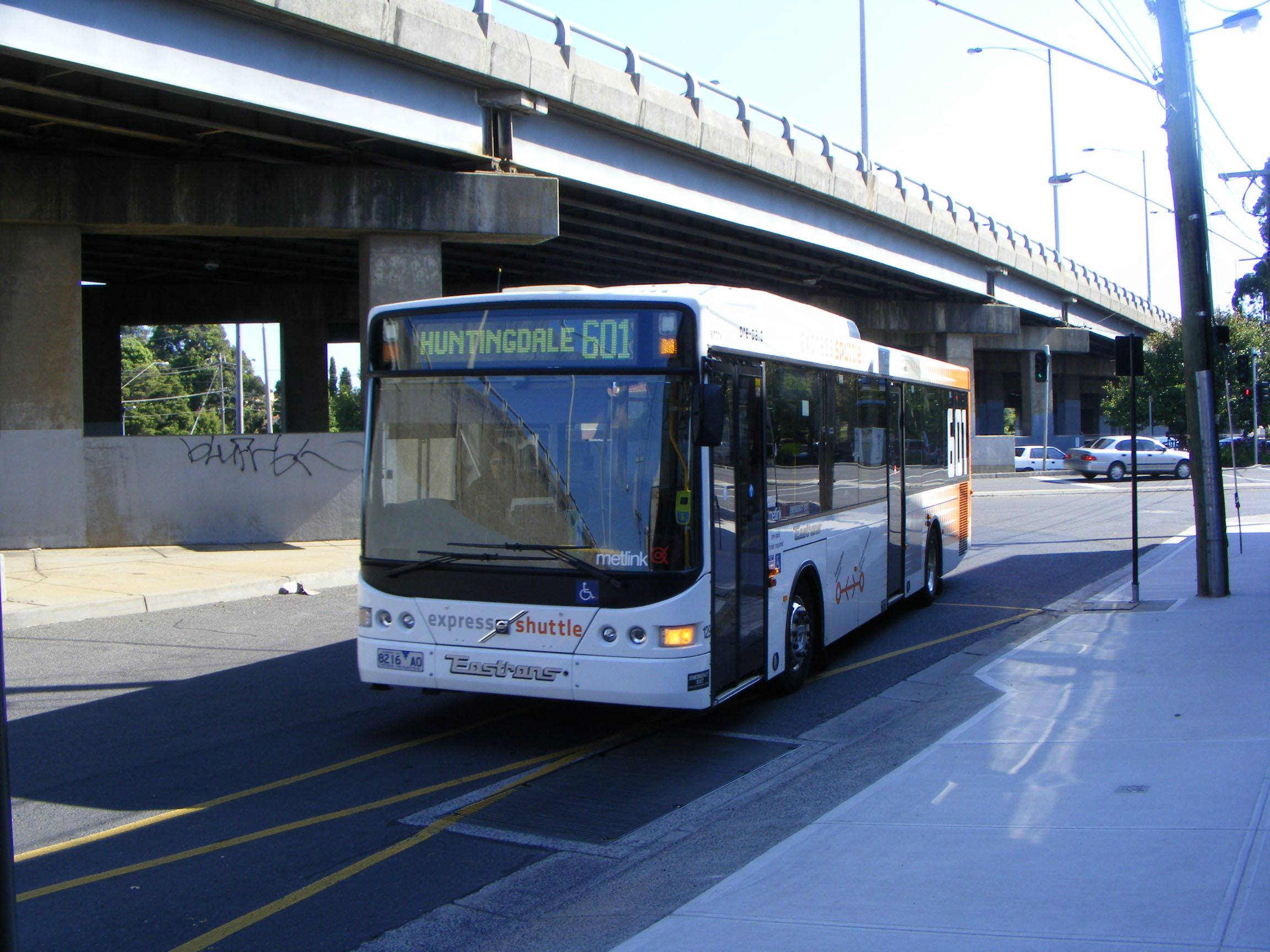 Launched in July 2012 was a 601 express shuttle between Huntingdale Station and Monash University's Clayton campus. The service mimics the 401 service started earlier serving Melbourne University and North Melbourne Station by SITA. The livery is identical to that used by SITA which blended with its fleet livery, howver the orange was in stark contrast to Eastrans' then white and green. A third university express started in 2016, operated by East-West with buses in full PTV livery but the same huge route numbers for the 301 between Reservoir Station and the Bundoora campus of La Trobe Uni. This view of Eastrans Volgren bodied Volvo B7RLE 128 (8215AO) arriving at Huntingdale was taken at the end of March 2012.