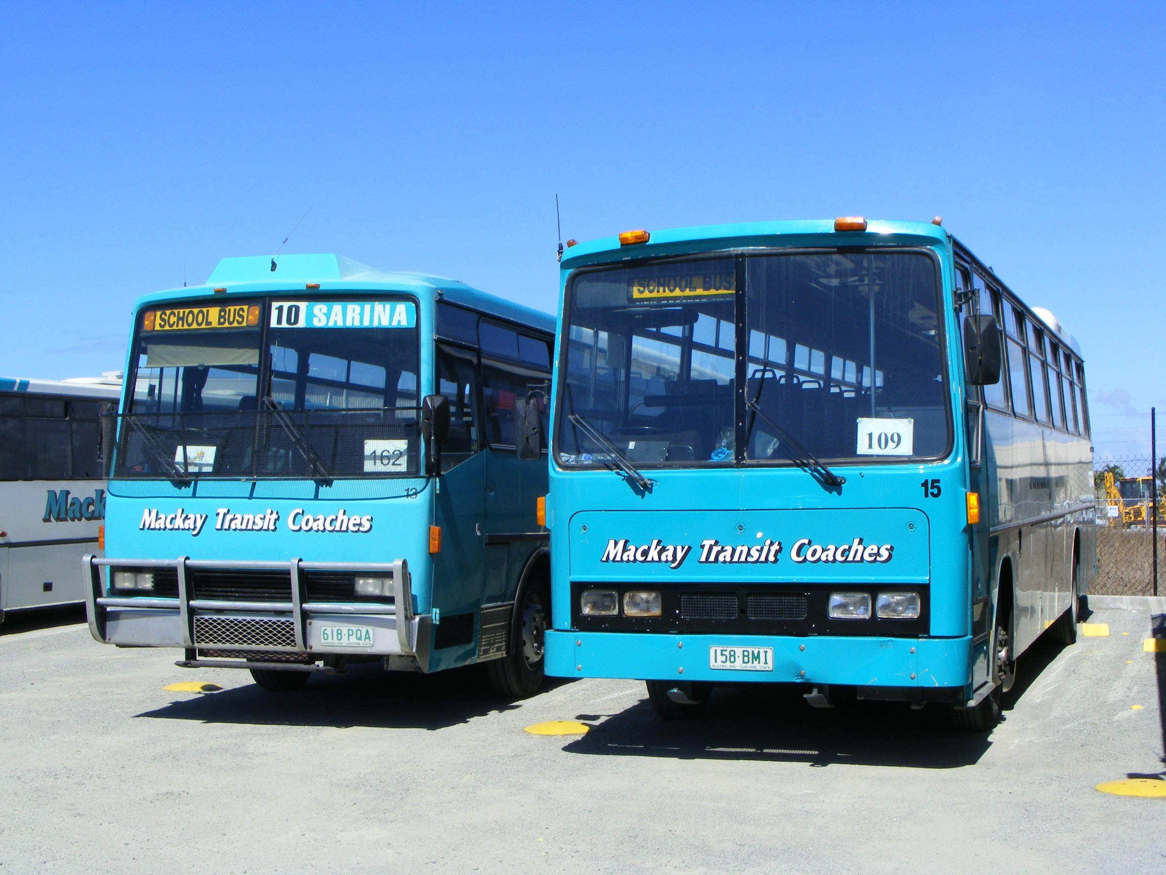 School and service buses are painted in a blue based livery as already seen on the Toyota Coaster. Ex Brisbane Denning bodied MAN SL200 buses used to predominate in the school bus fleet. Nearest the camera is 55 (620HTM) and next along is 41 (460HYN), formerly Brisbane 881 and 917, respectively. The third bus is identifiable as 97 (484LCG), former Latrobe Valley 11 (3811AO), a Hino RK176K with Custom bodywork. |